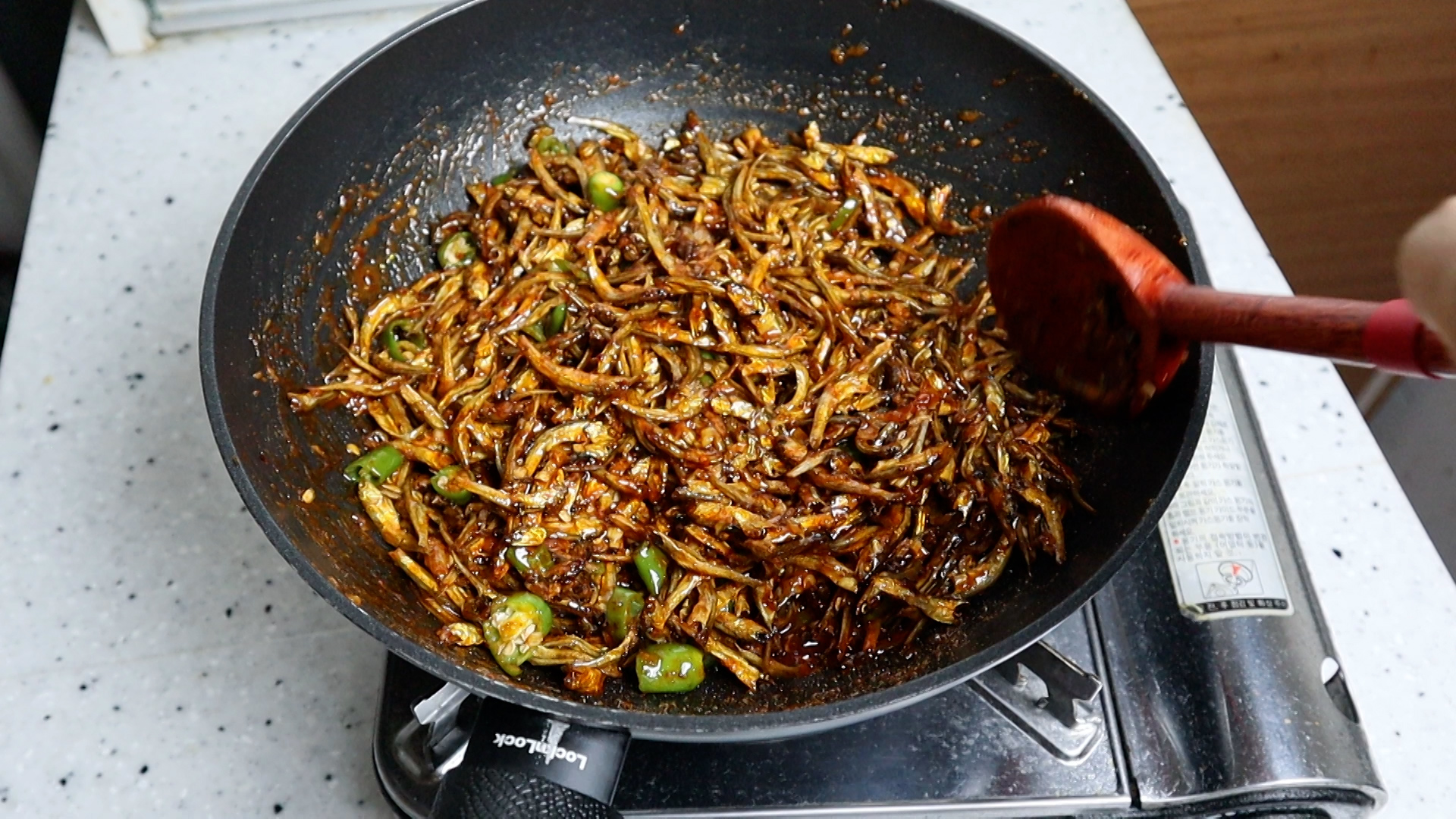 14. 양념과 고추를 넣고 대략 1~2분 볶으면 이렇게 맛있는 비쥬얼의 고추장 멸치볶음이 완성됩니다