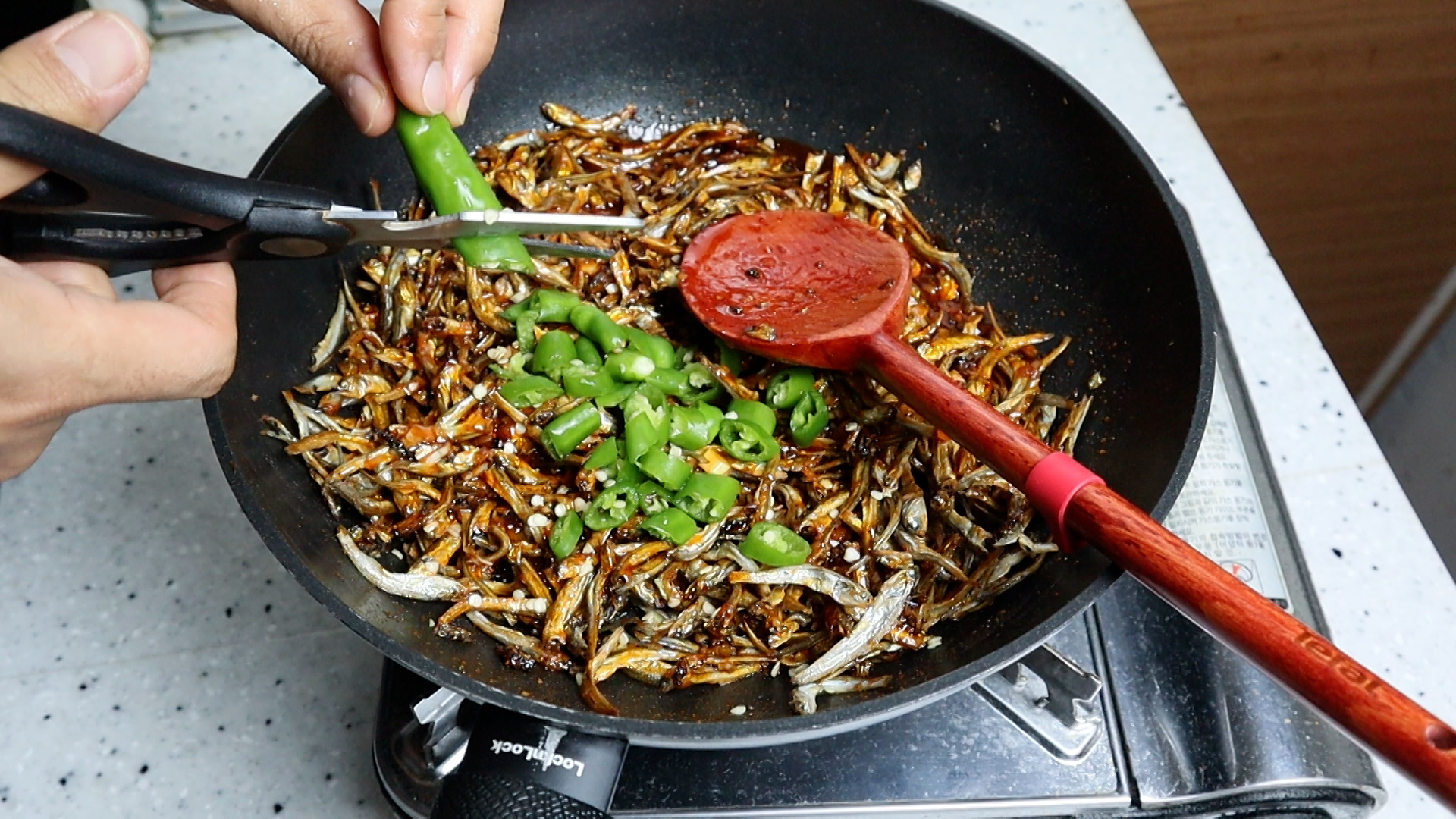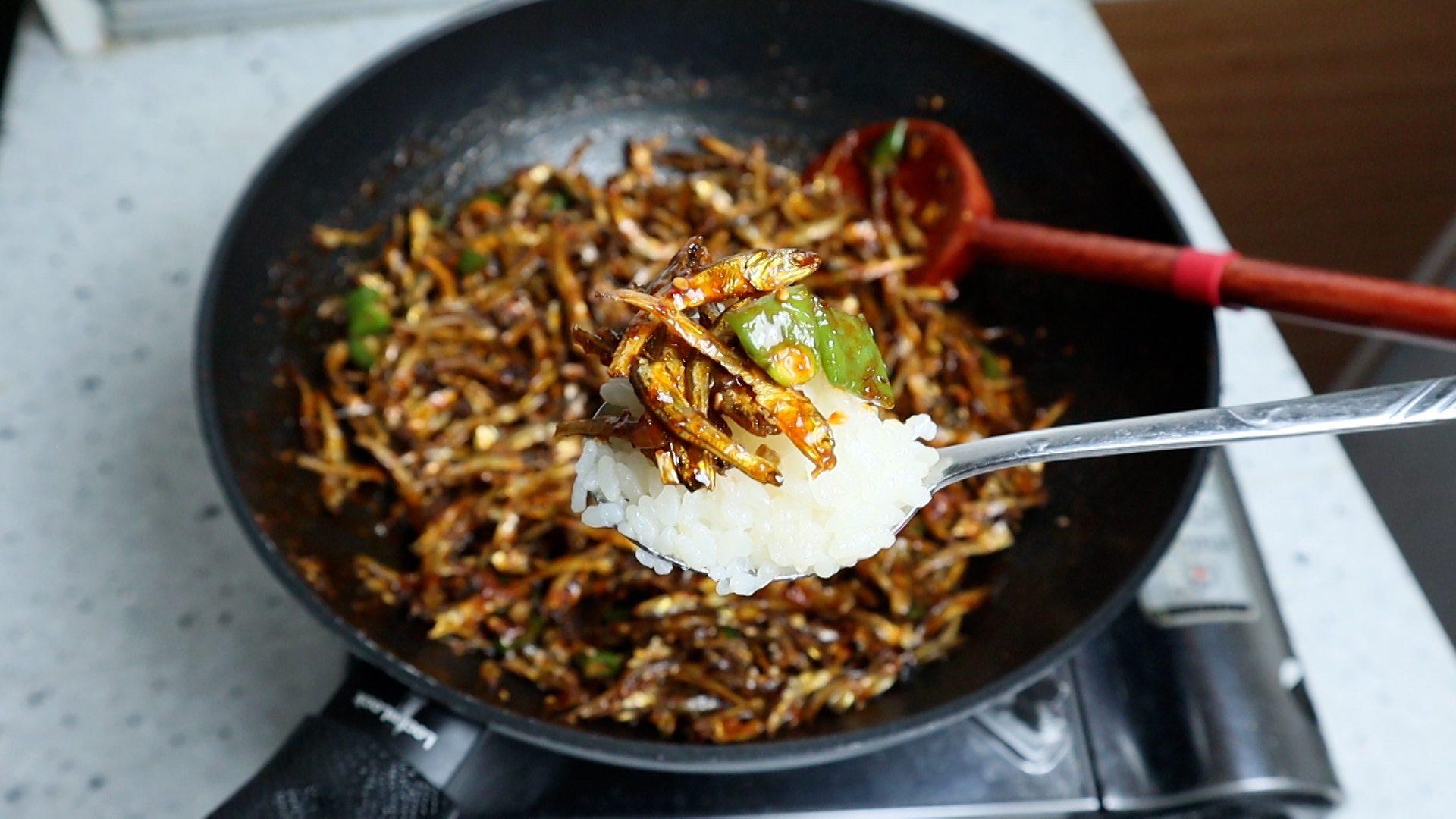 16. 맛있게 볶아진 고추장멸치볶음을 밥위에 땡초 올리고 멸치 듬뿍 집어 올려 먹으면 정말 맛있습니다! 물에 밥말아 먹을때도 끝내줍니다!