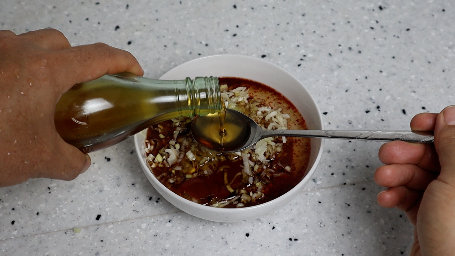 7. 식용유와 참기름을 넣어주시고 골고루 잘 섞어주세요.