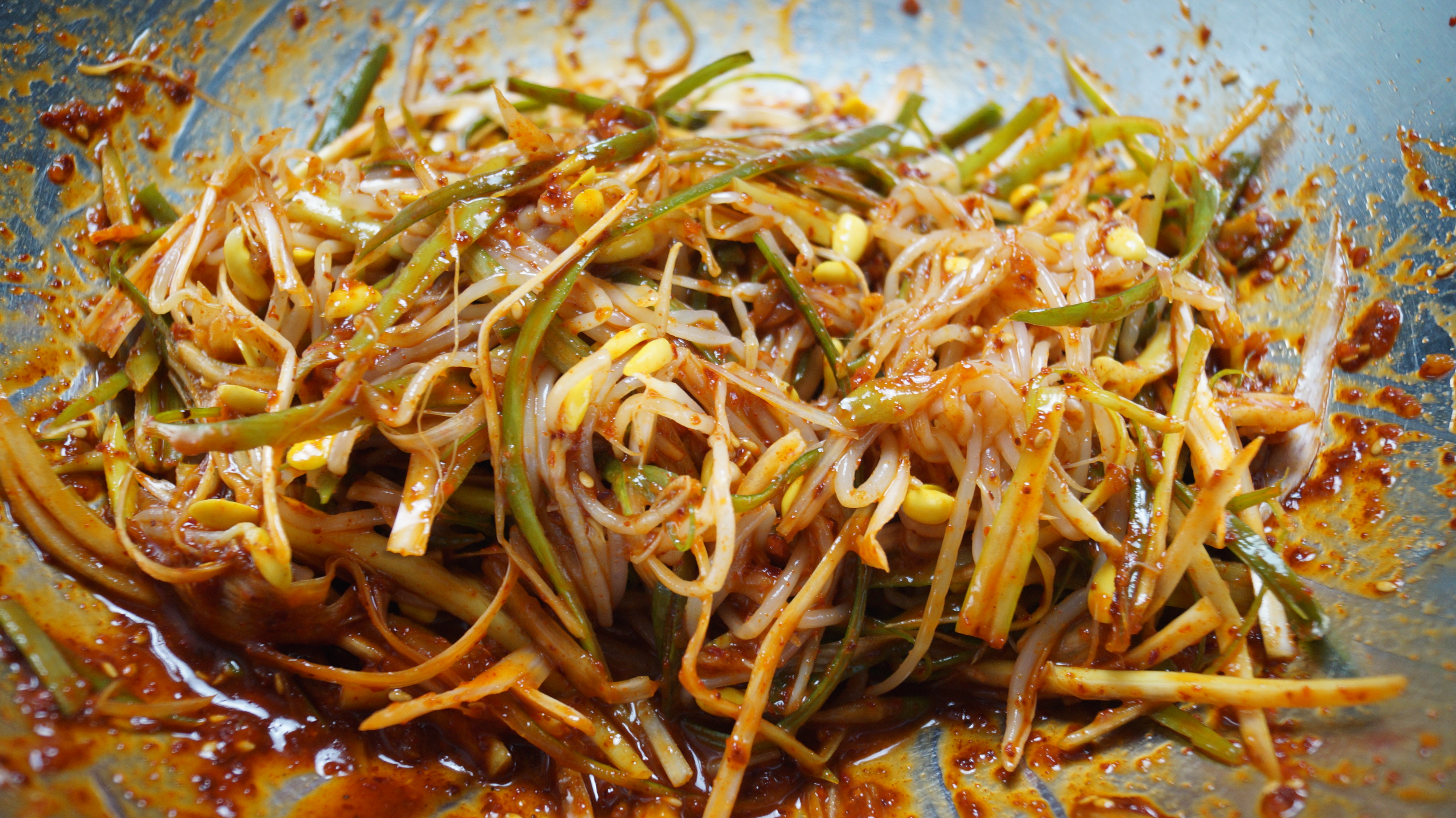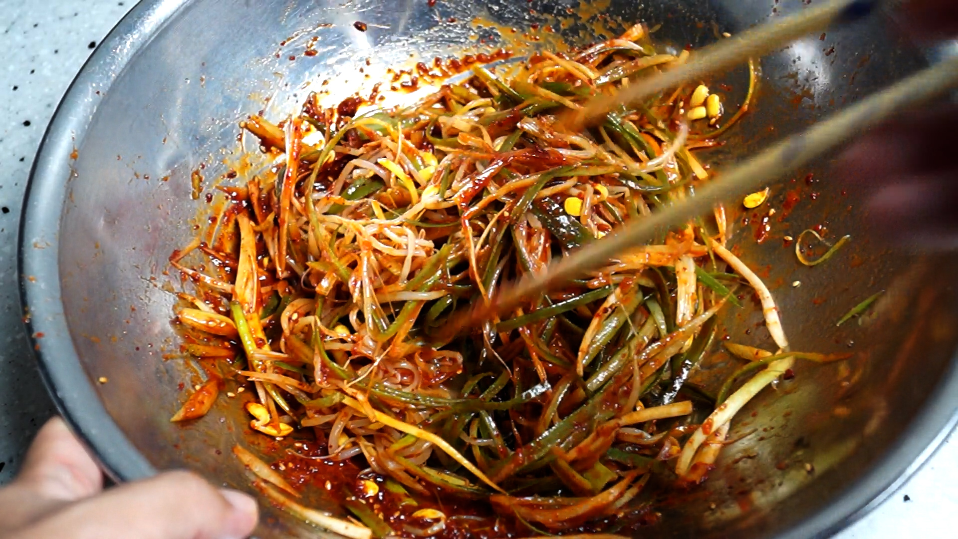 7. 양념에 물기뺀 대파와 콩나물을 넣고 버무리기 직전 재료 통깨, 참기름을 넣고 골고루 섞어주세요.