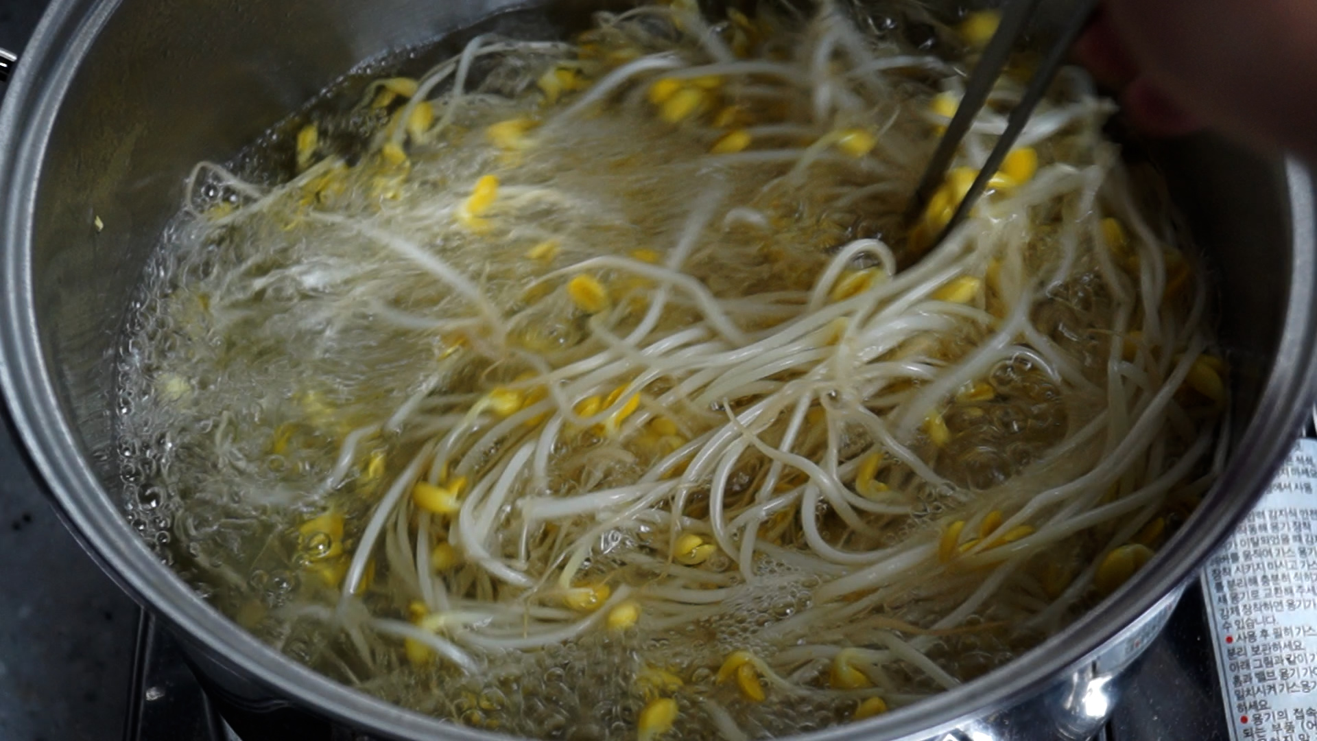 2. 파절이에 씹는맛을 올리고 싶으시면 대파는 절반만 채썰어 준비하고 콩나물 반봉지 150g 을 끓는물에 3분간 삶아주세요.