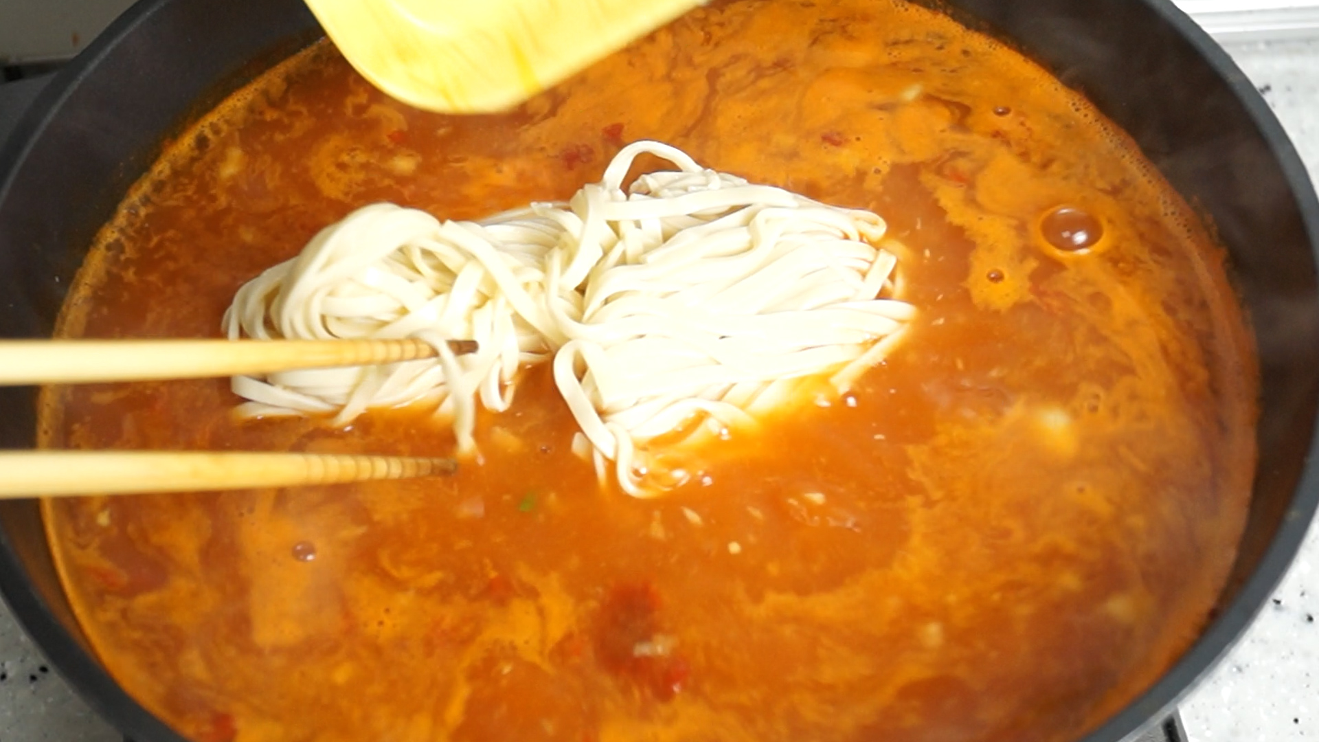 13. 감자넣고 2분을 끓인 다음 칼국수 면을 넣어주세요. 생면일 경우 설명서에 적힌대로 흐르는물에 가볍게 헹궈 밀가루를 씻어주세요.