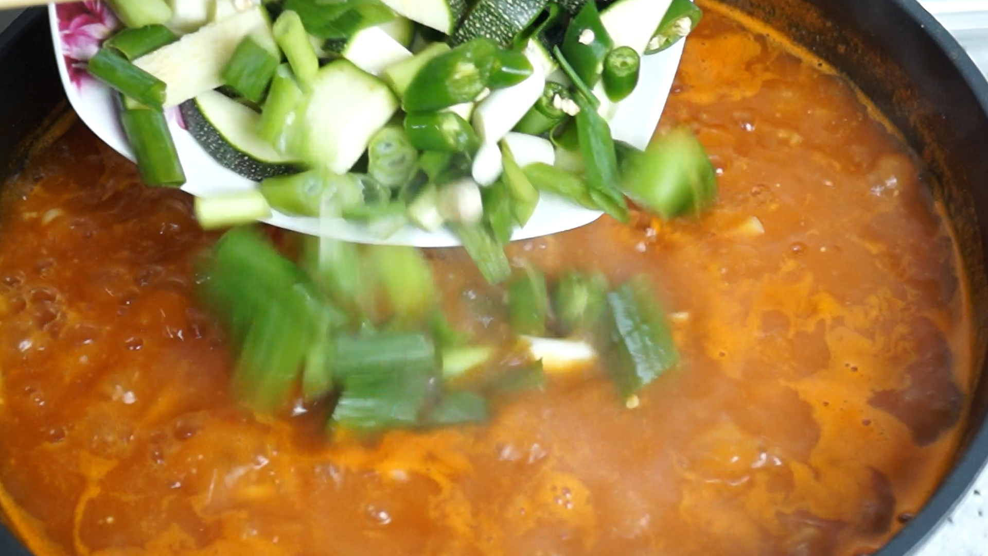 15. 칼국수 완성 2분 전에 대파,호박,청양고추,콩나물을 넣어주세요.