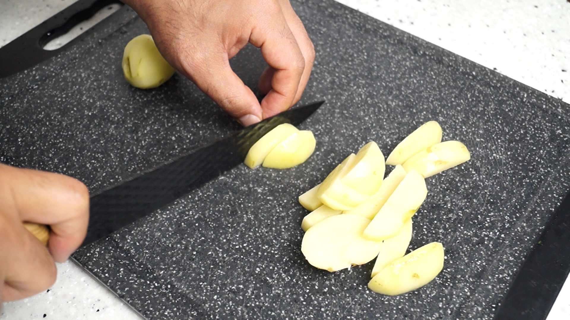 3. 감자는 주먹만 한걸로 1개를 준비해서 두께를 1cm 로 썰어주시고 나머지 크기는 기호에 맞게 썰어주세요.