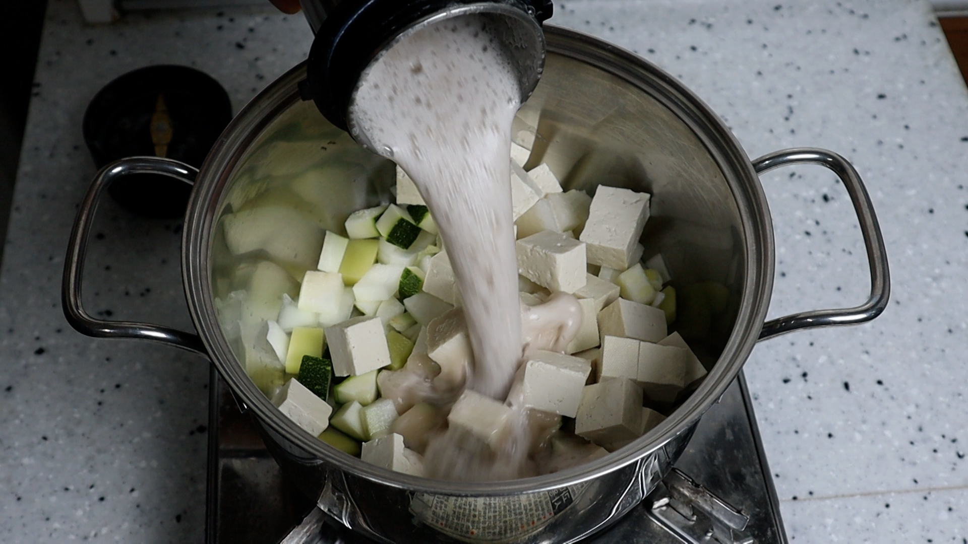 8. 냄비에 썰어놓은 재료를 전부 넣고 갈아놓은 재료도 넣고 물 또는 멸치다시마육수 4컵 800cc 를 부어주세요.