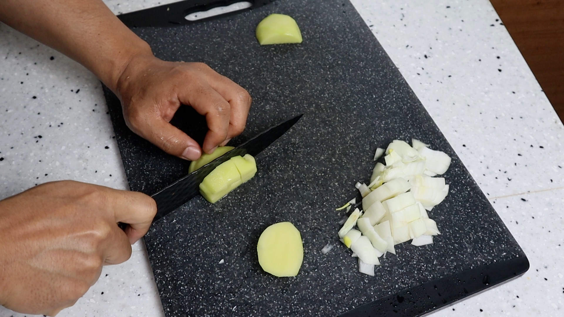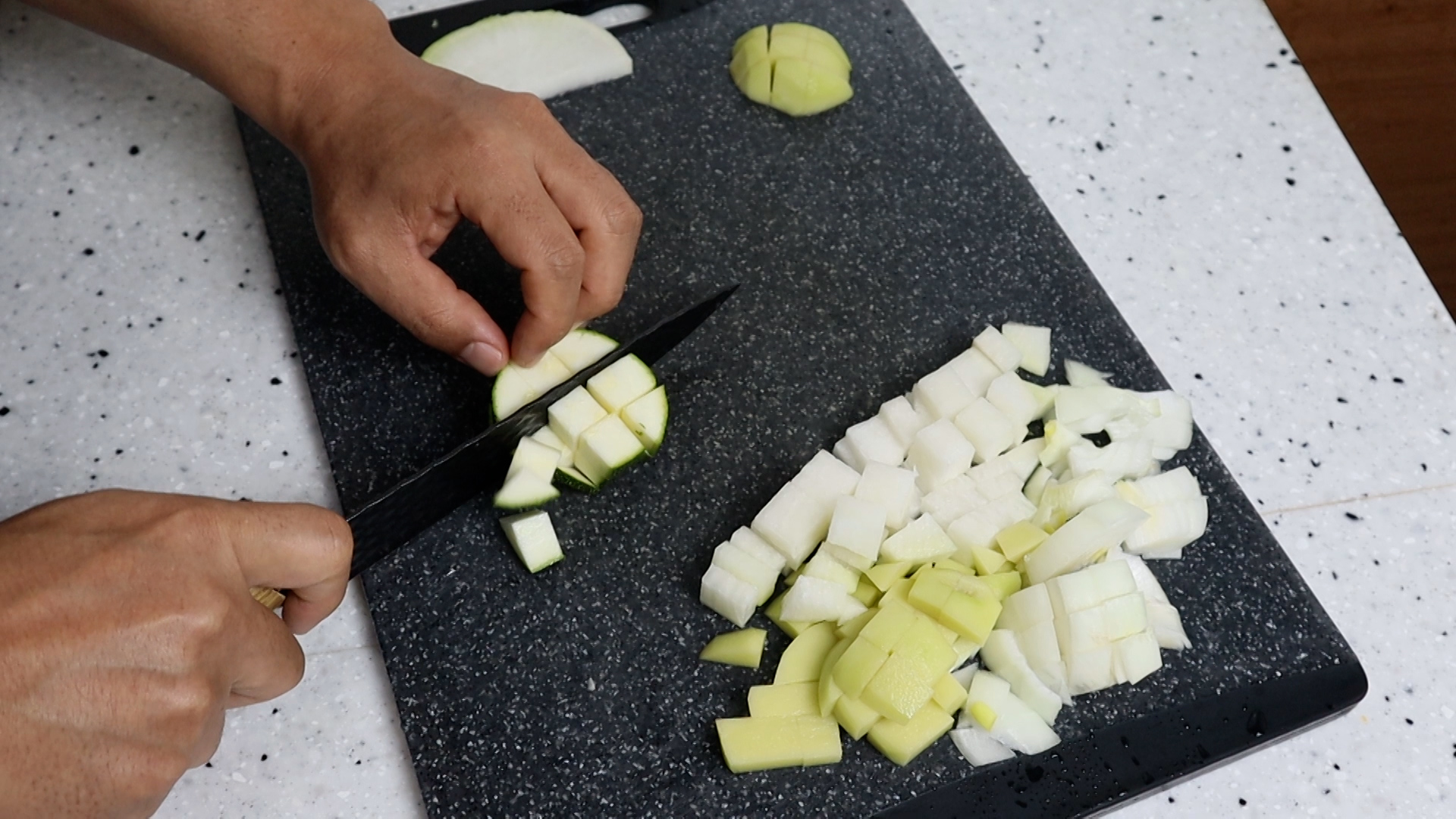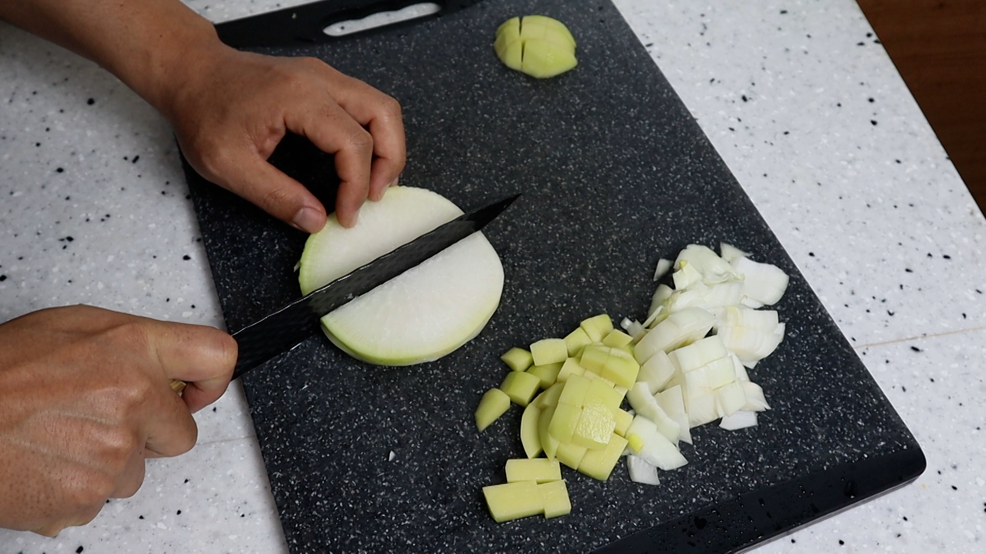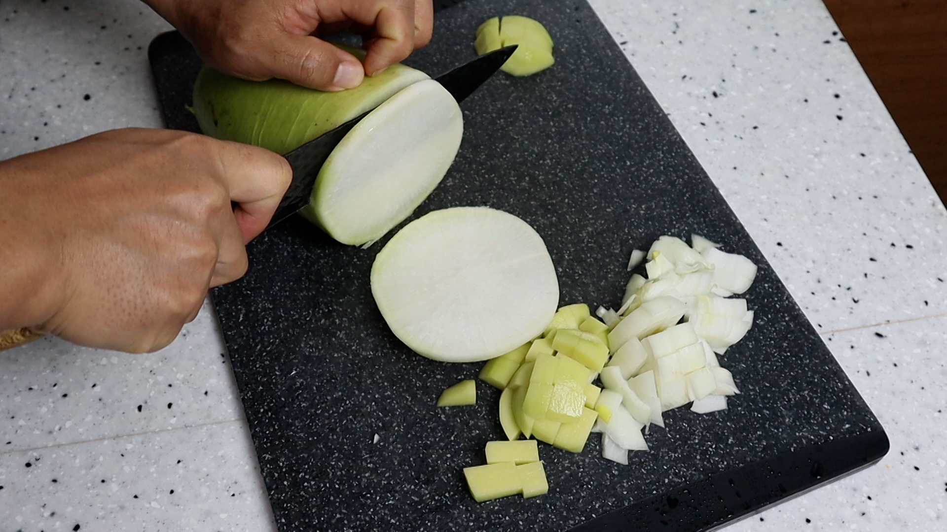 4. 무우 4조각중 1조각은 감자와 함께 따로 빼두시고 남은 3조각은 2~3cm 크기로 썰어주세요.