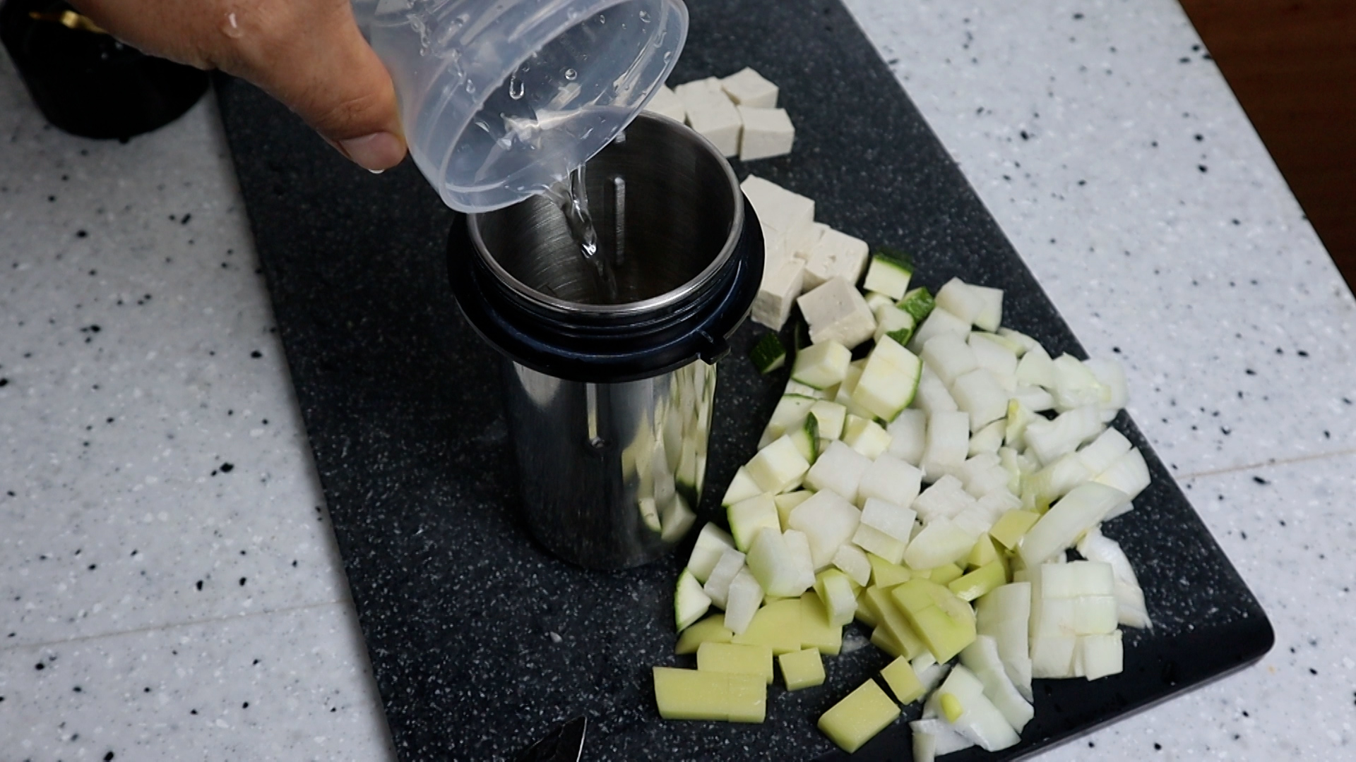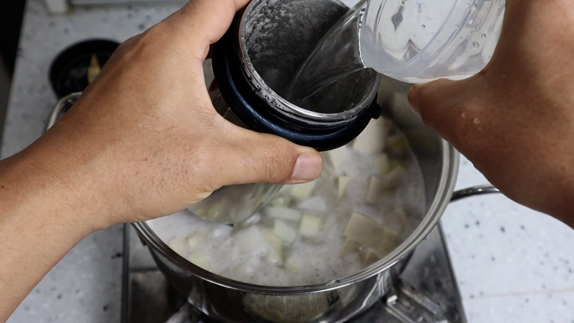 9. 물 4컵중 1컵은 재료를 갈았던 믹서기 통에 넣고 흔들어서 벽에 붙은 재료들까지 헹궈서 같이 부어주시면 좋습니다.
