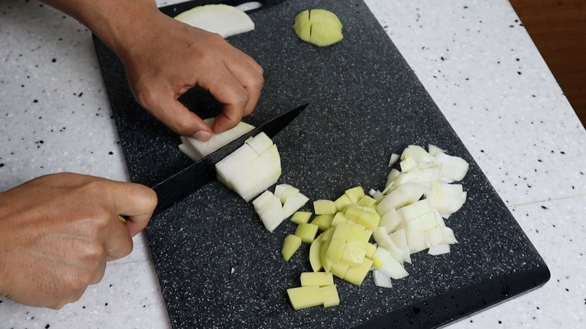1. 된장찌개에 절대 빼먹을수 없는 영혼의 단짝! 양파 중간거 반개를 기호에 맞게 썰어주세요. 저는 숟가락에 재료가 종류별로 올라오는게 좋아서 재료를 1~2cm 정도로 좀 잘게 썰었습니다.