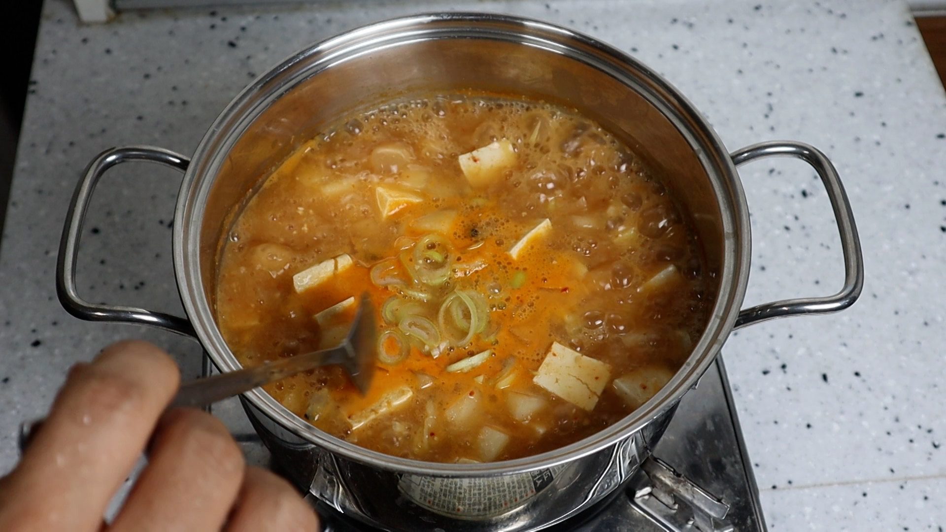 17. 5분 끓인 다음 소고기나 해물 중 골라서 100g 을 넣어주셔도 되고 그외 꽃게,냉이,달래,미더덕등을 재료를 기호에 맞게 넣어주세요.