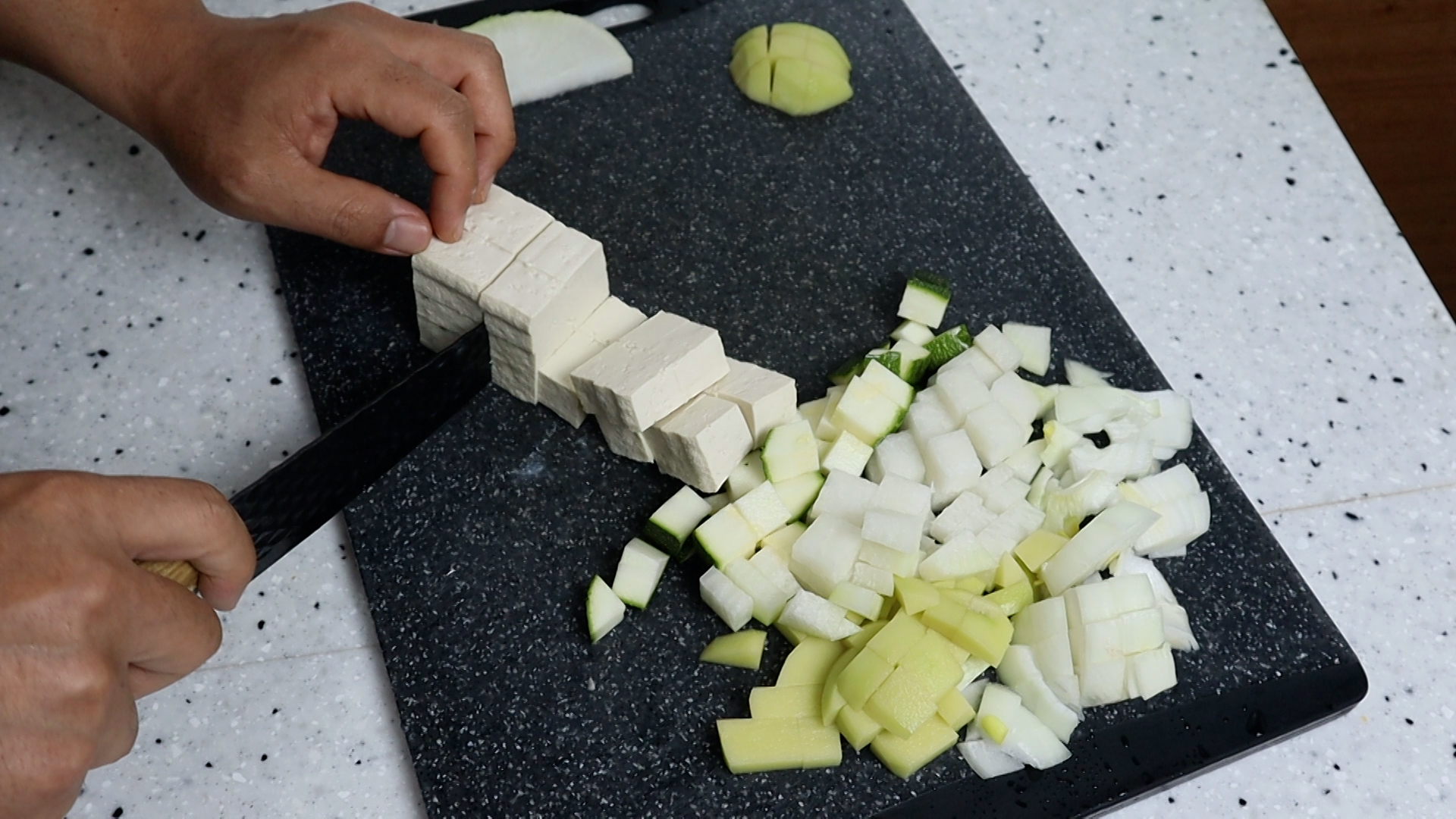 6. 두부는 단단한 부침용 두부로 먹기 좋은 크기로 썰어주세요. 찌개용 두부는 수분이 많아서 부들거리는거라 수분이 많은 대신 콩함럄이 그만큼 떨어지고 잘 부서져서 저는 그냥 부침용을 사용한답니다.