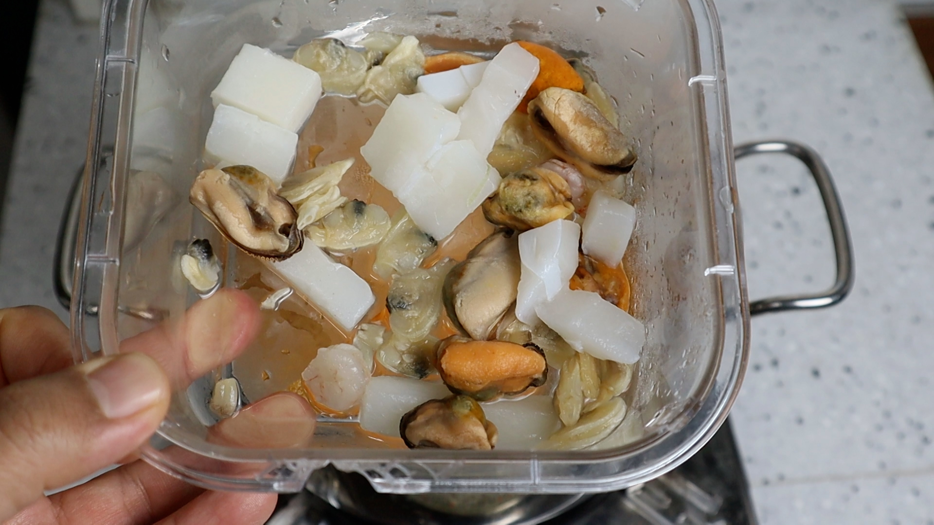 7. 믹서기에 아까 따로 빼둔 감자와 무우 그리고 물 100cc 를 넣고 곱게곱게 갈아주세요. 감자와 무우를 갈아서 찌개에 넣으면 찌개가 묵직하면서고 깊은맛이 생겨 제대로 찌개 느낌 난답니다.