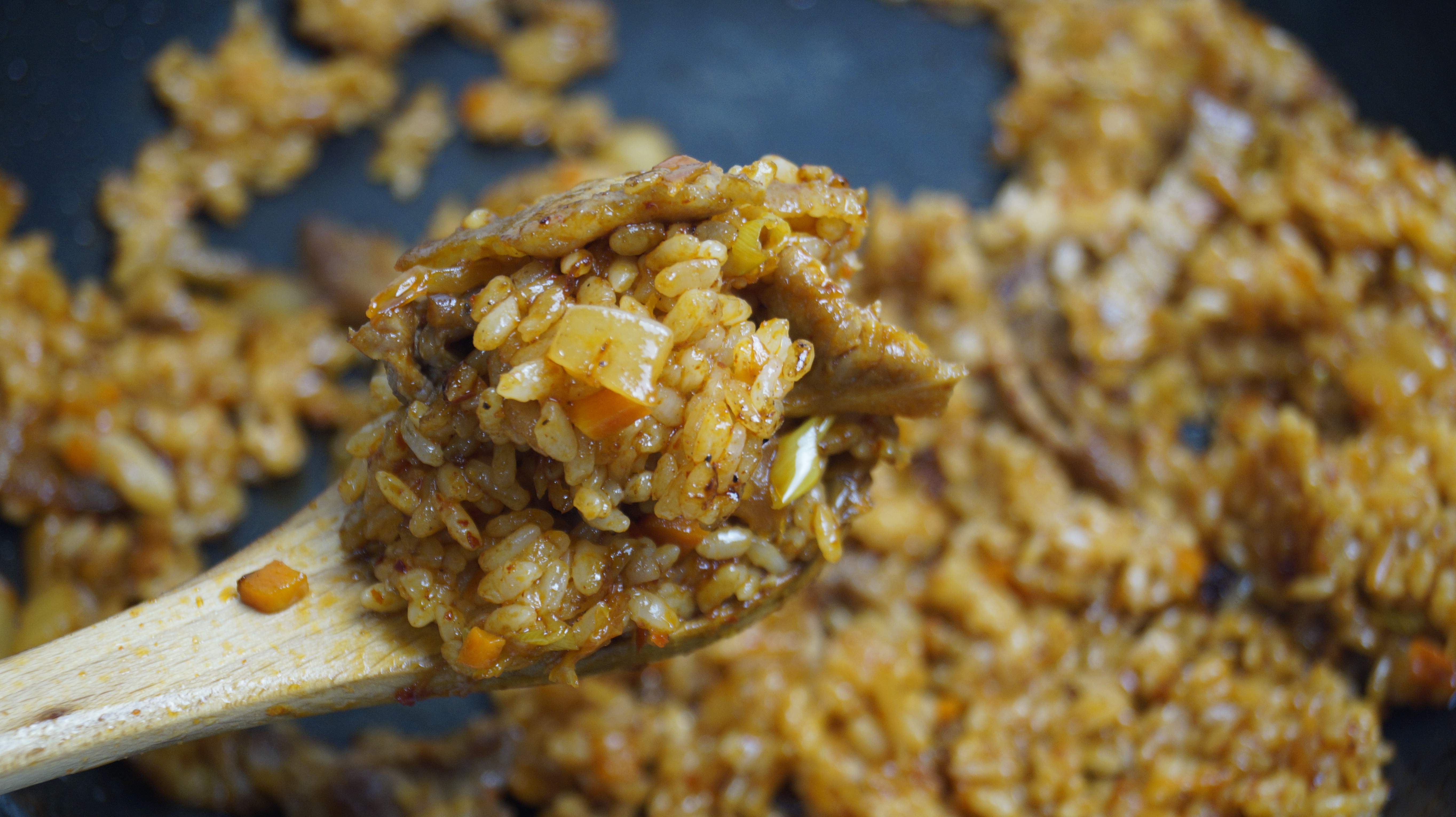 18. 밥을 넣고 골고루 섞어가면서 약불에 볶아주세요. 밥 양은 볶아서 색감보시고 추가하시면 좋습니다.