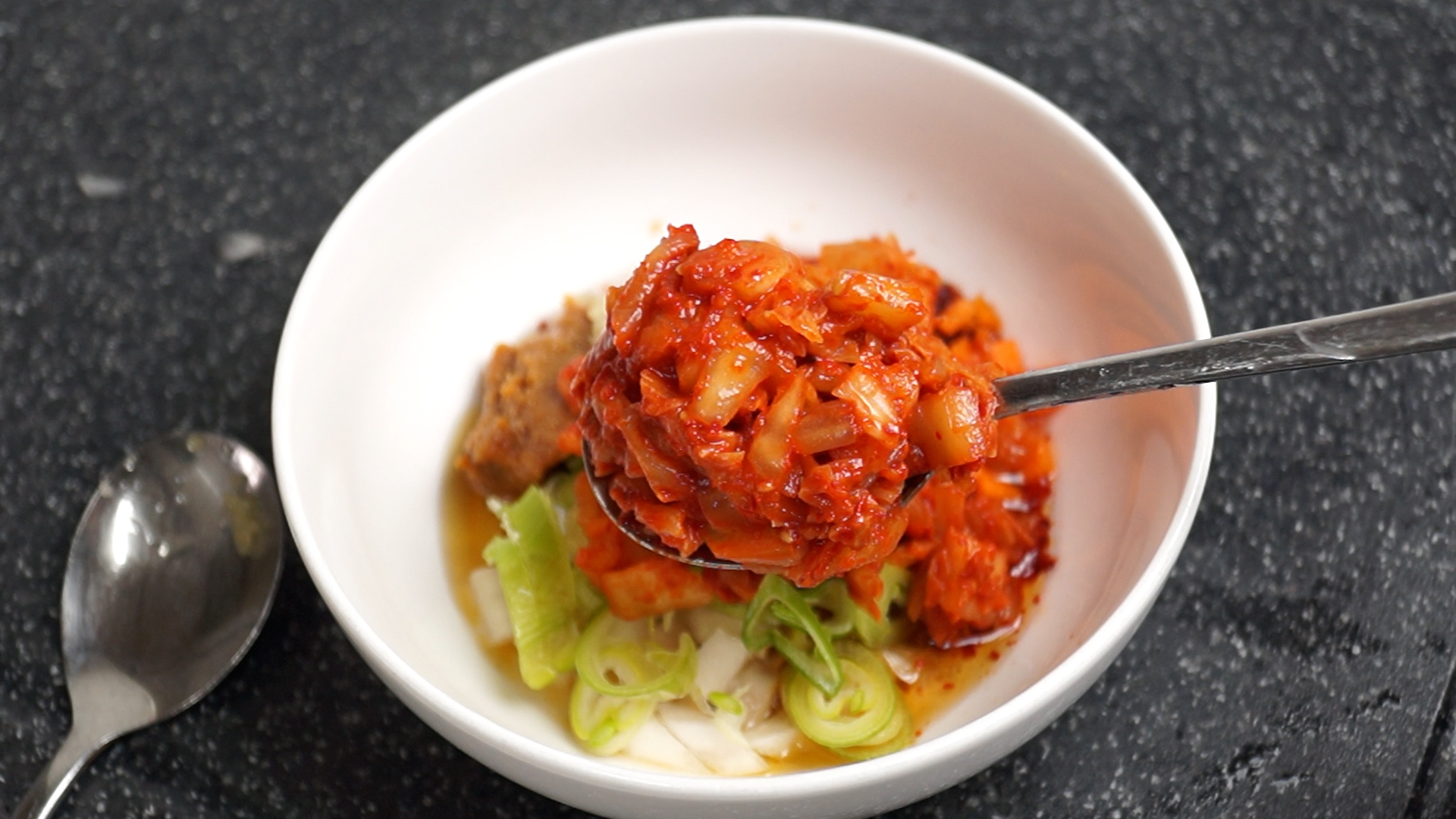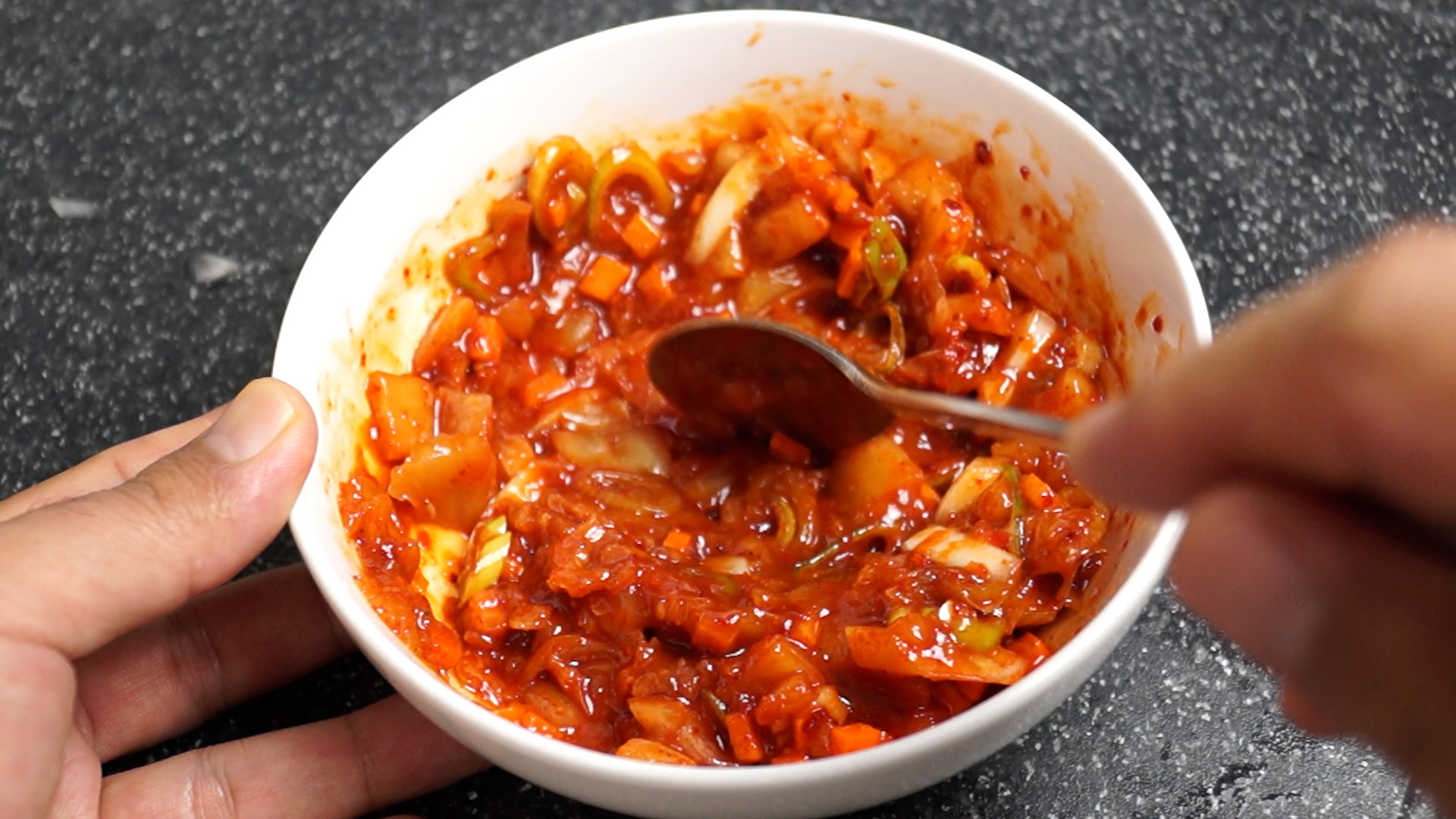 13. 적당히 익은 김치를 잘게 잘라서 3큰술 고봉으로 퍼서 넣어주세요.