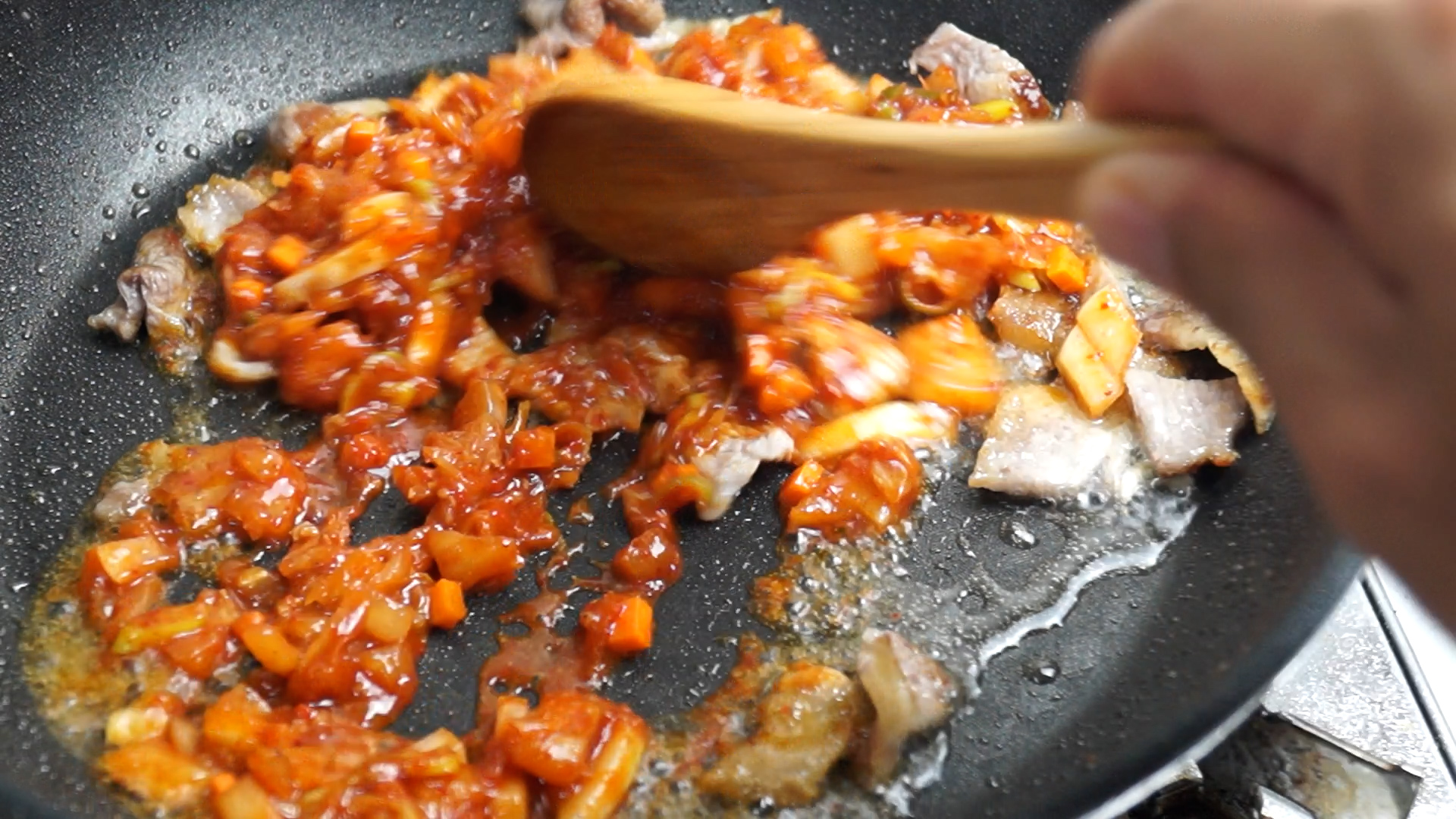 5. 된장을 살짝 넣어주시면 고깃집 불판에서 각종 재료가 눌려서 볶아지는 깊고 찐한 맛을 어느정도 구현할수 있답니다.