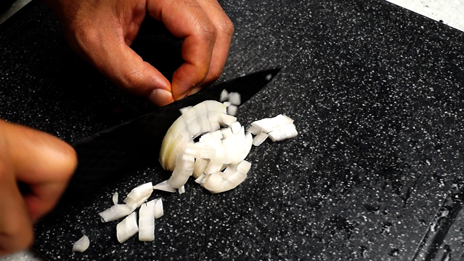 2. 양파도 다져주세요. 볶음밥에 양파 넣으면 하수?? 라고 하실수 있지만 고깃집 볶음밥은 불판에 밥과 양념을 좀 눌려야 제맛이 나기 때문에 수분이 있는 양파를 넣으면 눌리 동안 타는것도 방지하고 양파 단맛이 양념이 진한 스타일의 고깃집 볶음밥 맛을 더 맛있게 해준답니다.