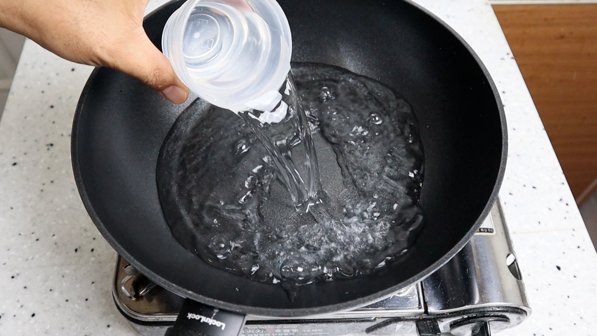 2. 냄비에 물 2컵 400cc 를 부어주세요. 수분 증발이 빠른 웍에 할때는 50cc 정도 더 부어주시는게 좋아요.