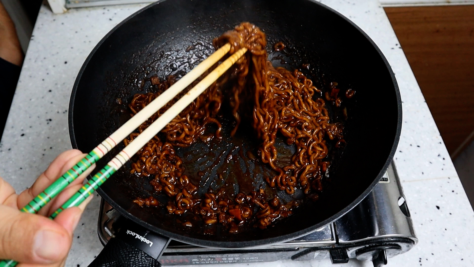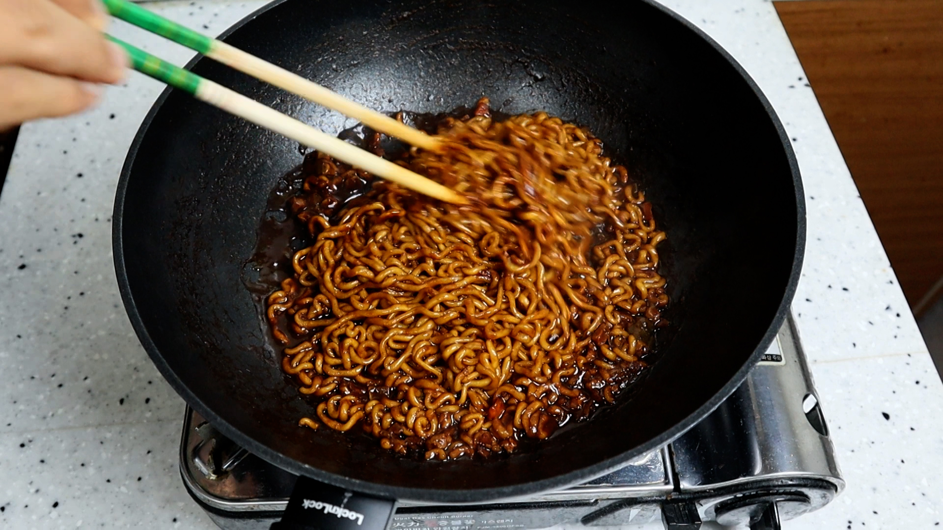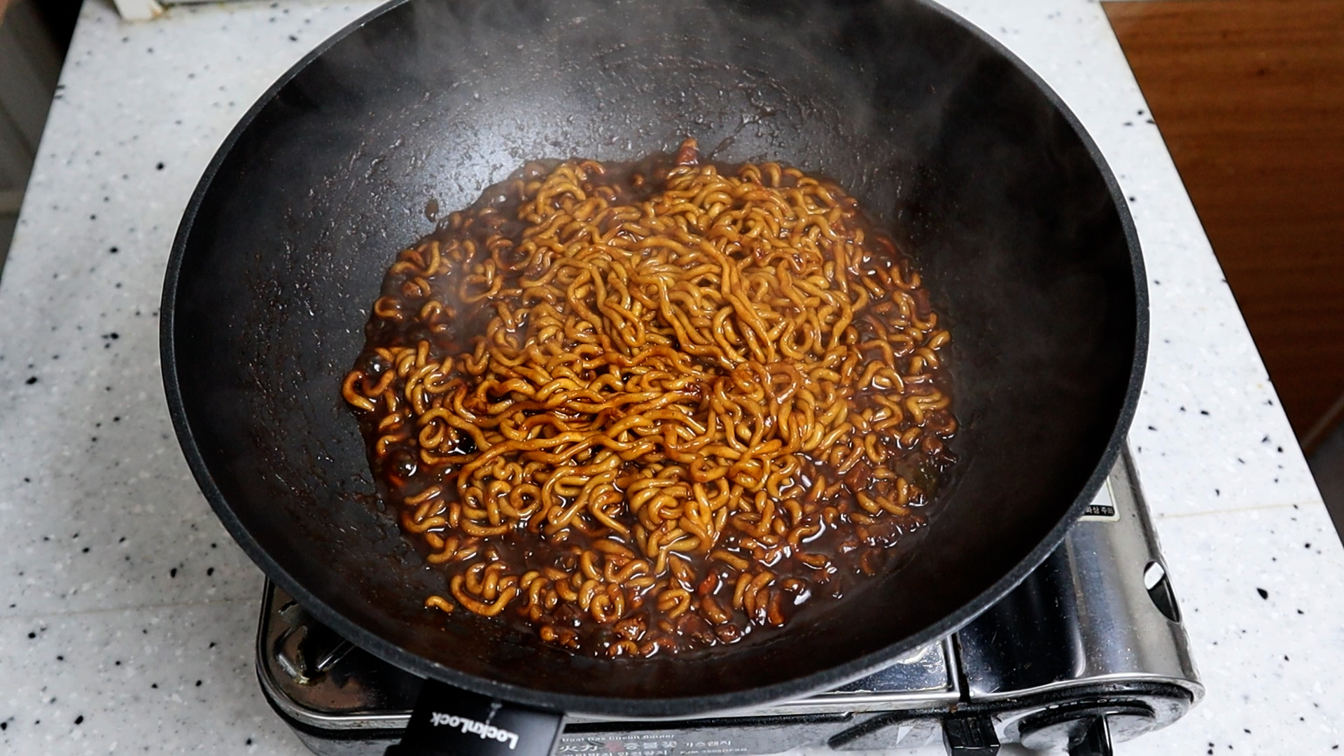 8. 골고루 섞어가면서 나머지 2분 30초를 볶아주며 익혀주시고 한줄만 먹어보고 면이 덜익었으면 물을 50cc 정도 추가해서 볶는 시간을 늘여주시면 됩니다.