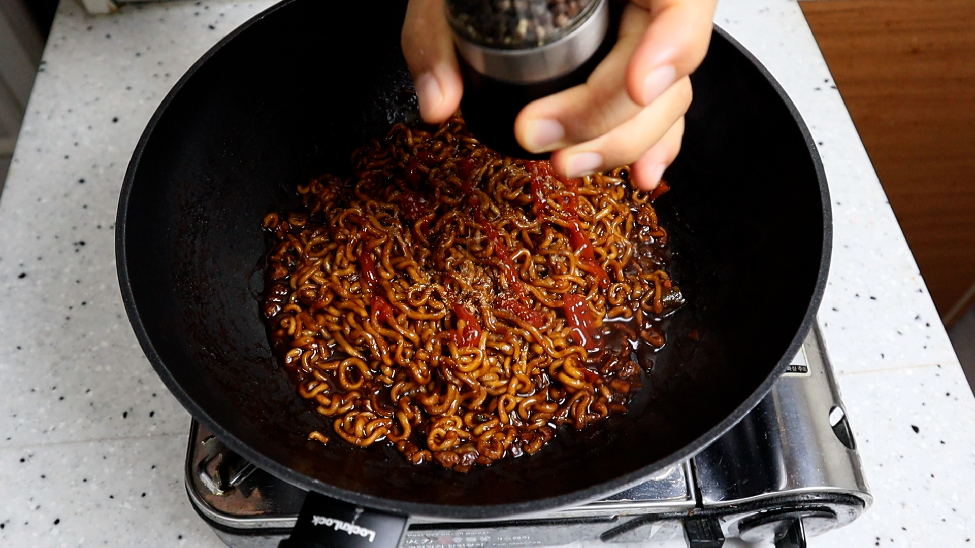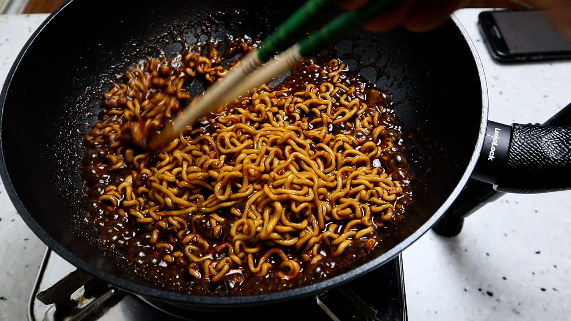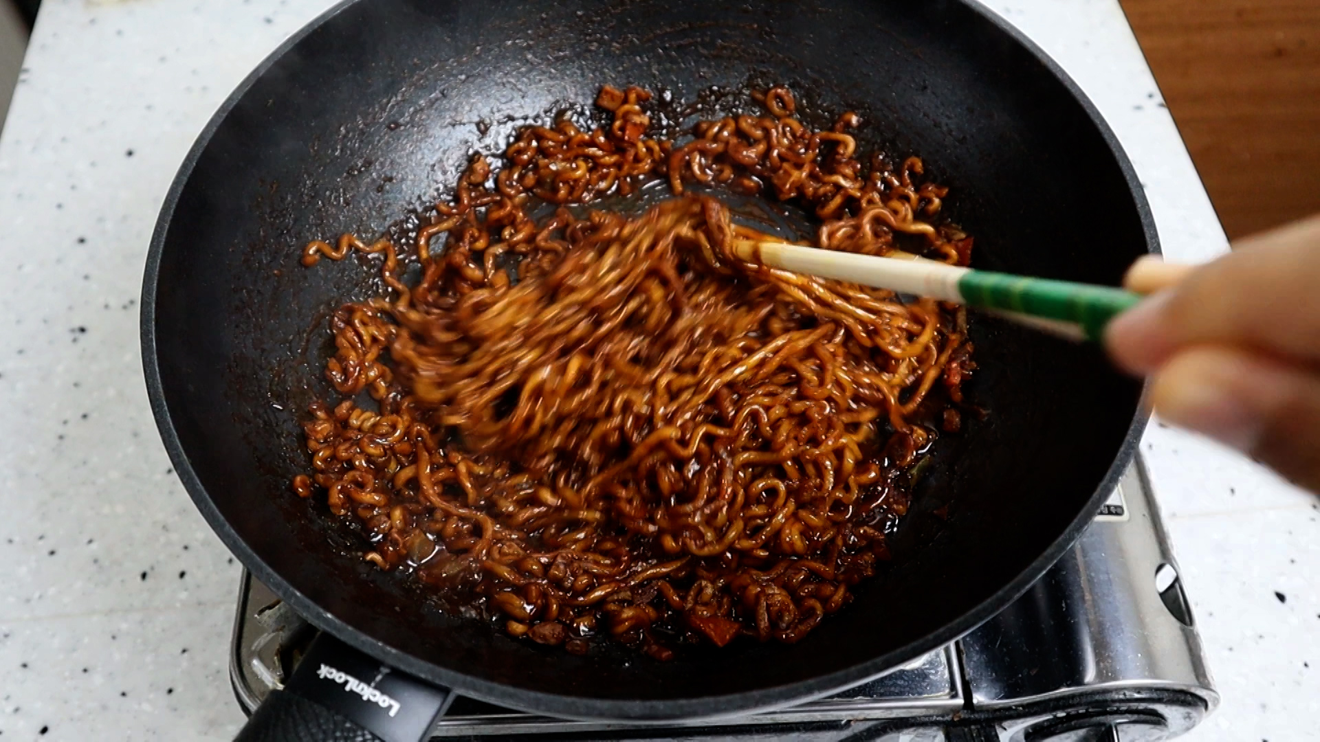 8. 골고루 섞어가면서 나머지 2분 30초를 볶아주며 익혀주시고 한줄만 먹어보고 면이 덜익었으면 물을 50cc 정도 추가해서 볶는 시간을 늘여주시면 됩니다.