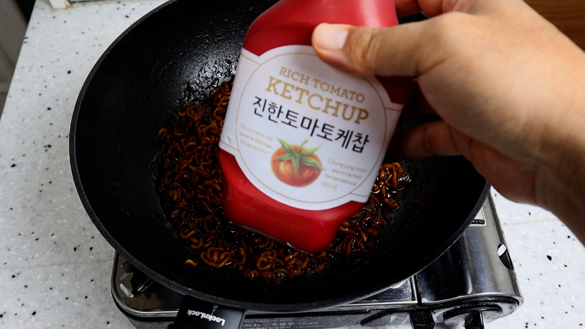 10. 이제 여기에!! 과감하게 케찹을 반스푼 정도 뿌려주세요. 너무 많이 부으면 케찹향이 강할수 있으니 사진에 보시는것 처럼 조금만 뿌리세요! 양이 애매하시면 롯데리아 감튀 찍어먹는 1회용 케찹 1개가 8~9g 이니 그정도 양 또는 그걸 하나 짜 넣으시면 됩니다.