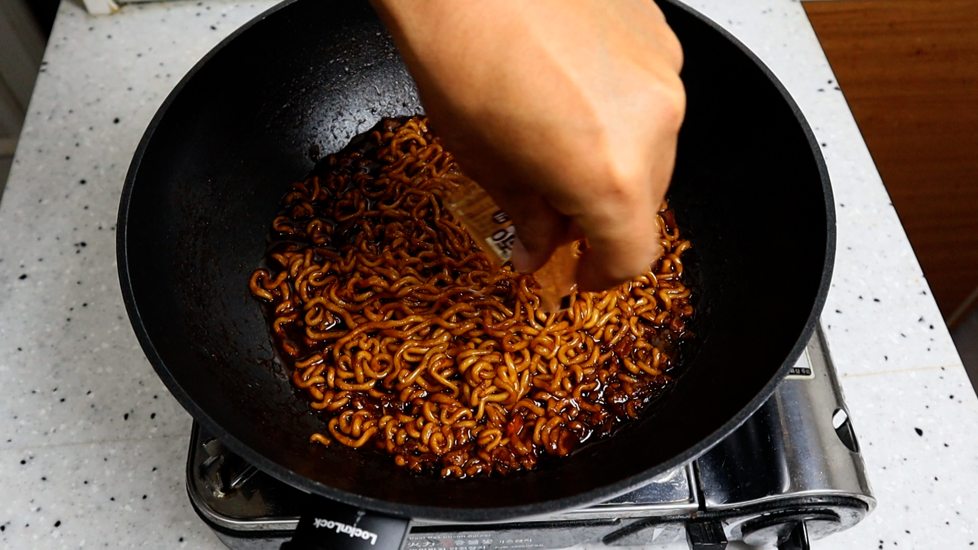 7. 2분 30초를 끓인 후 짜장가루를 부어주세요. 원래 짜파게티로 해먹을땐 짜장스프를 처음부터 물과 같이 넣고 졸이며 볶았는데 짜술랭은 면을 먼저 익힌 다음 짜장가루를 넣으라 되어 있어서 고민을 하다!! 그래도 스프를 같이 졸여야 맛있기도 해서 적당히 타협해서 2분30초 면을 끓인다음 스프를 넣고 나머지 2분 30초를 더 볶기로 했답니다 ㅎㅎ