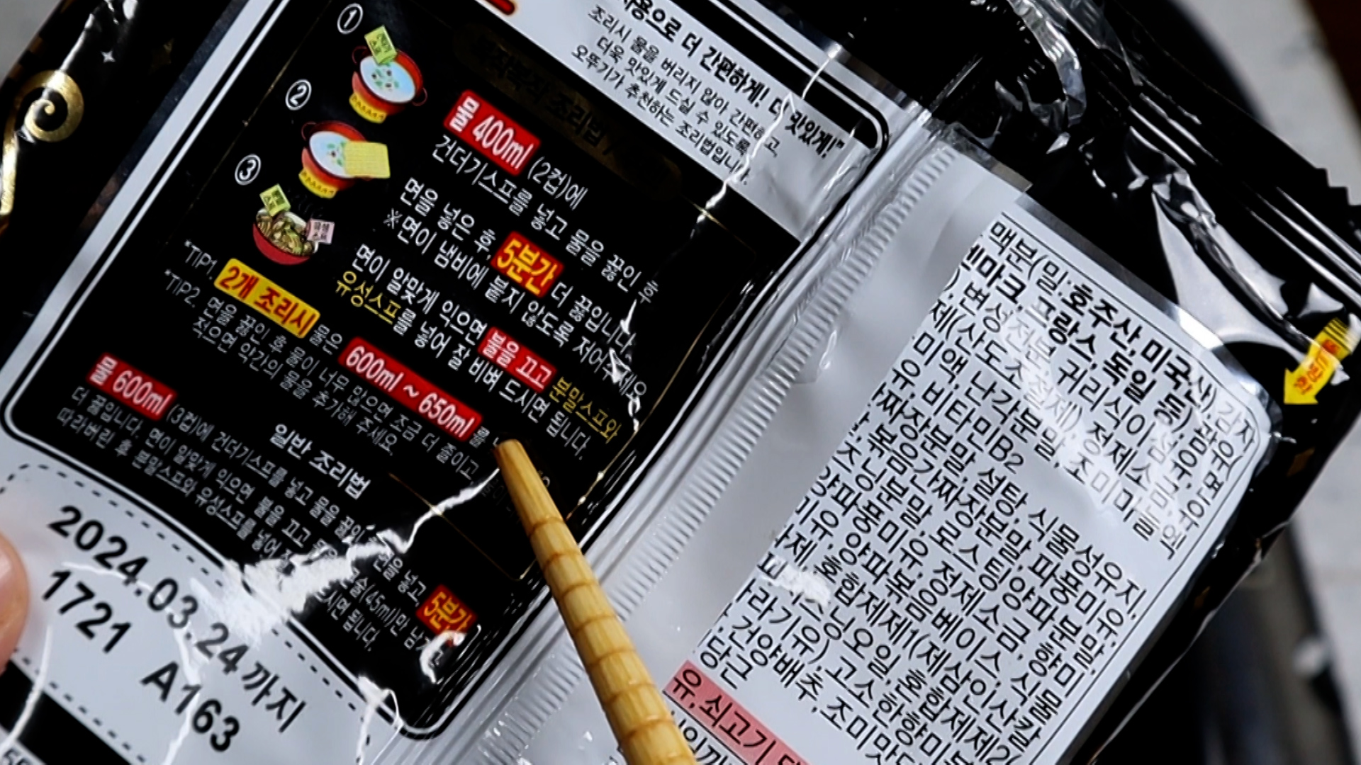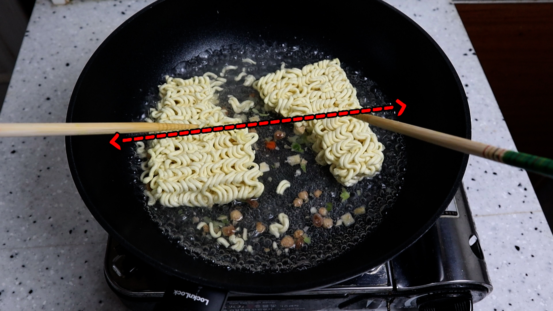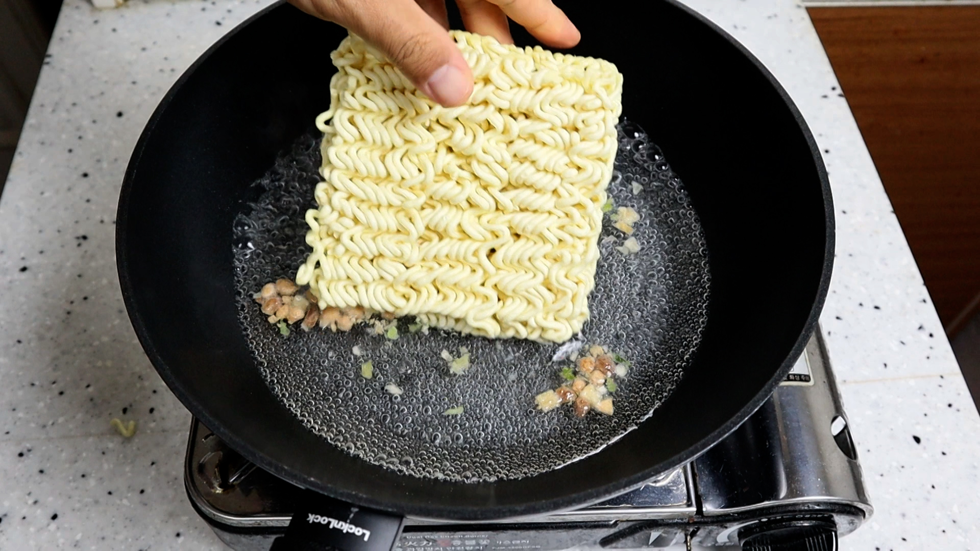 4. 건더기 넣고 면도 넣어주세요. 면은 기호에 따라 반으로 쪼개셔도 됩니다. 여기서 팁 하나! 면이 길어서 끊어 먹는게 싫으시면 면을 잘보시면 길이 방향으로 면이 꼬불꼬불 있는데 이걸 길이 방향으로 쪼개지 말고 길쭉한 부분을 반으로 가르면 면의 길이가 반으로 줄어들어 젓가락으로 잡을때 면이 길게 늘어지지 않아 먹기 편합니다.