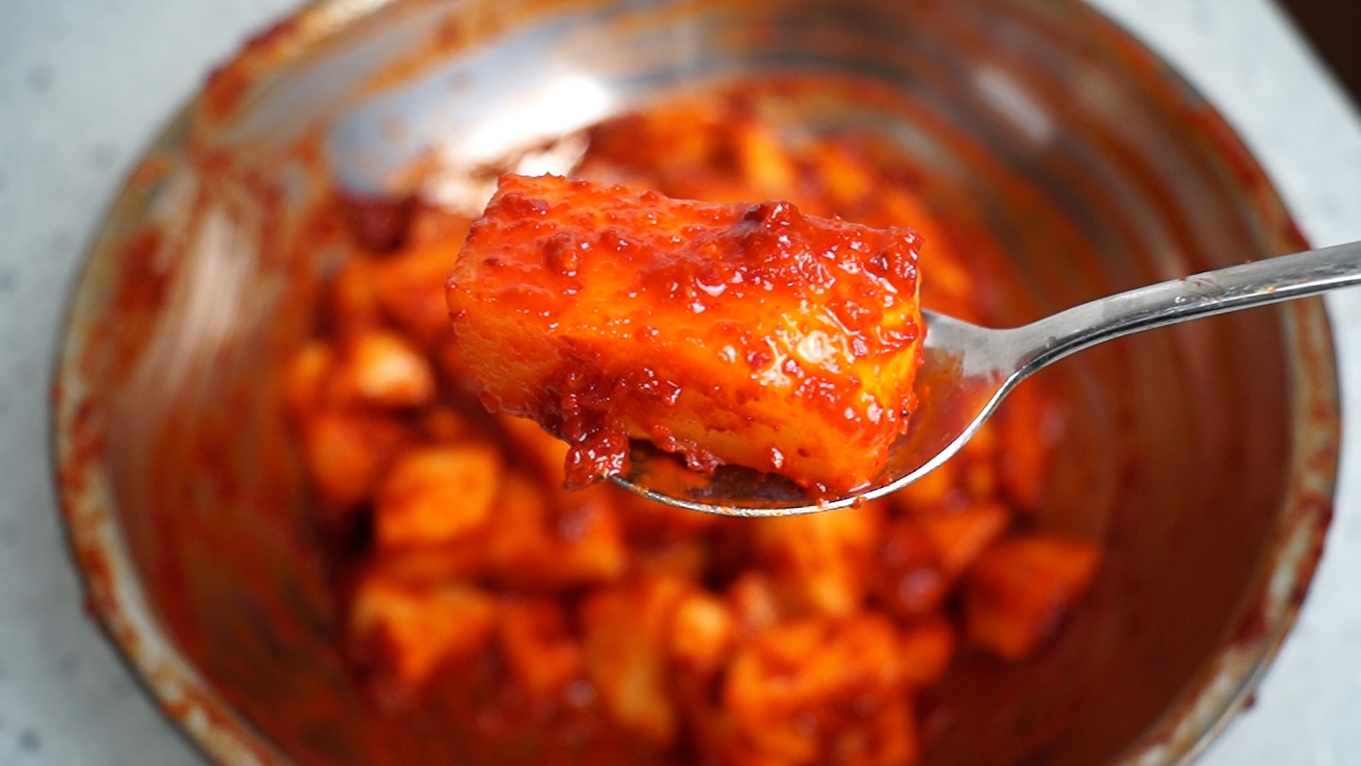 15. 우선 양념의 80% 정도를 넣은 다음 골고루 버무려 보시고 색감을 보신 다음 양념을 추가하거나 남기시면 됩니다. 남은 양념은 다음 김치 할때 섞어서 쓰시면 좋아요~