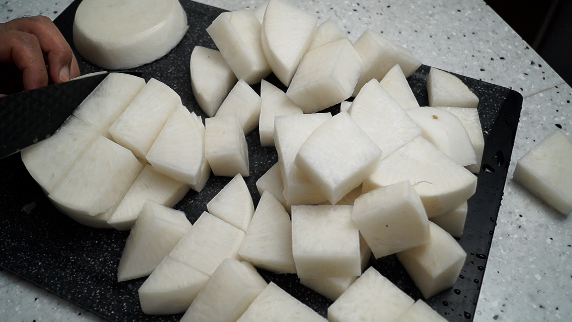 1. 무우 2kg 짜리 2개를 준비해서 두께는 2~3cm 정도로잘라주시고 크기는 기호에 따라 잘라주세요. 대략 8~9등분 해주면 식당에서 먹던 큼직큼직한 딱 그 정도 크기가 나오더라고요.