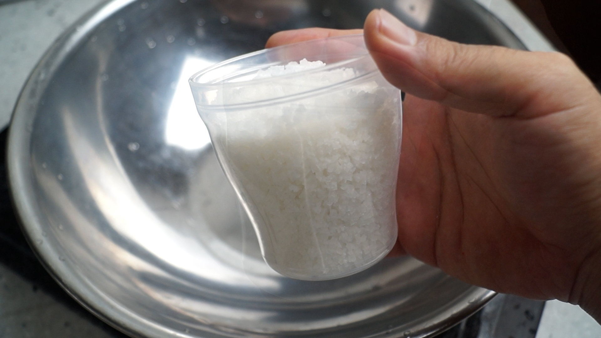 2. 굵은 소금을 볼에다가 부어주세요. 소금 200cc 컵에 1컵 준비하면 대략 170~175g 이 나옵니다.