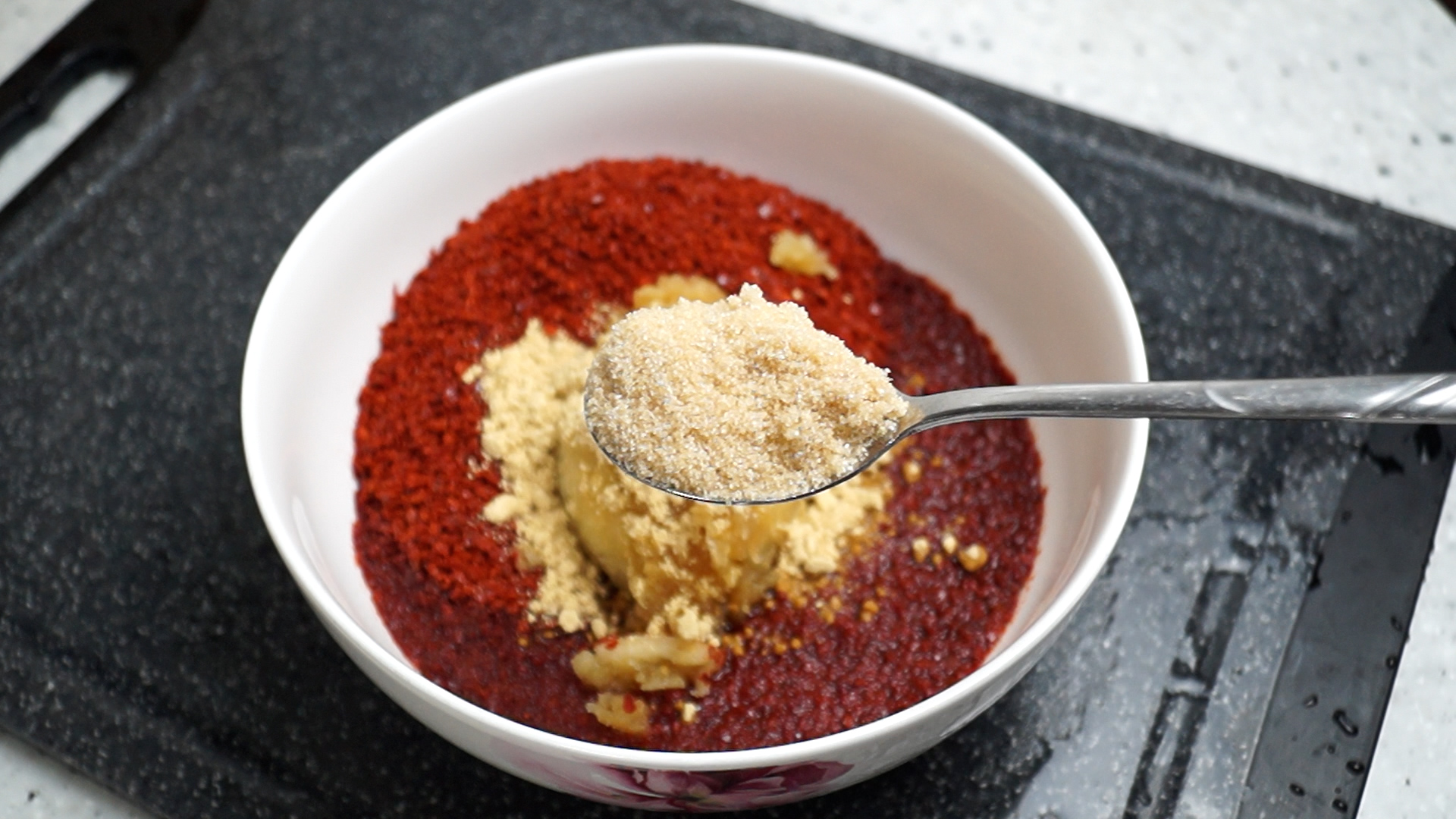 5. 무우를 절이는 동안 양념란에 적힌 재료를 볼에 한데 전부 넣어주세요. 고춧가루를 200cc 컵에 2컵 담아 볼에 부어주세요.