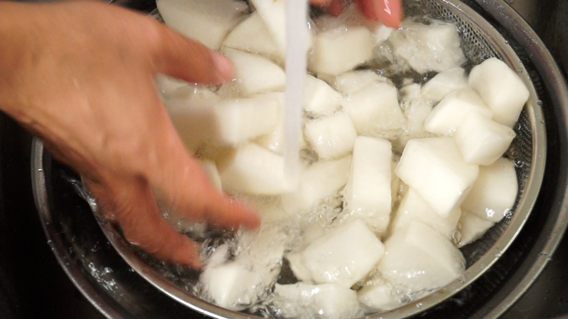 14. 절인무우를 깨끗하게 1번 씻어준 다음 채반에 올려서 30~40분 물기를 빼주세요.