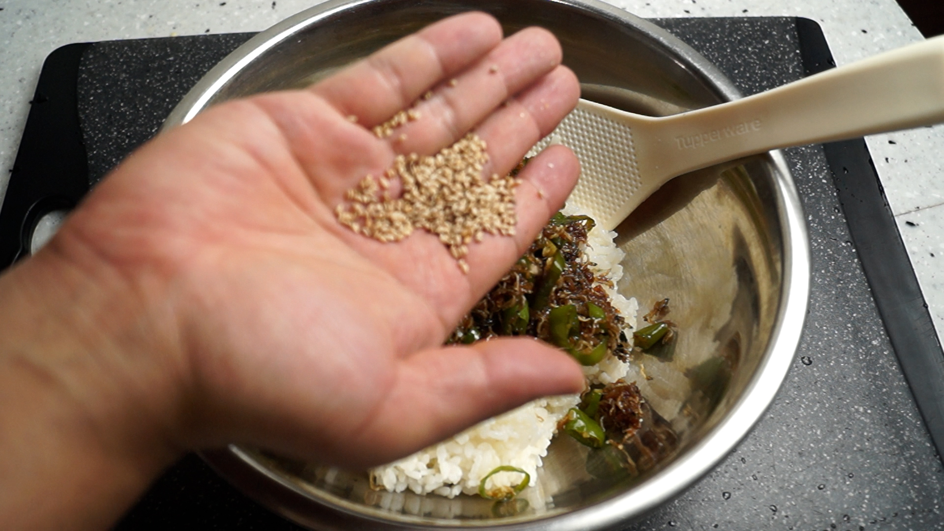 22. 참기름반스푼 정도만 부어주시고 김가루도 적당량 뿌려주세요. 김가루가 좀 들어가야 밥이 더 잘 뭉친답니다.