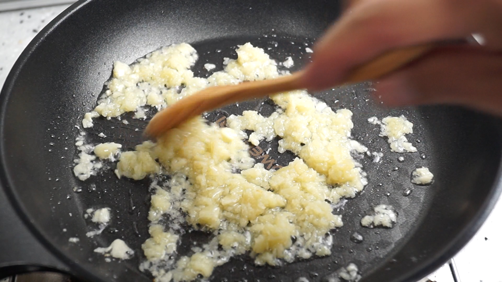 14. 약불에 기름과 마늘이 자글거리기 시작하면 1분을 볶아주세요.
