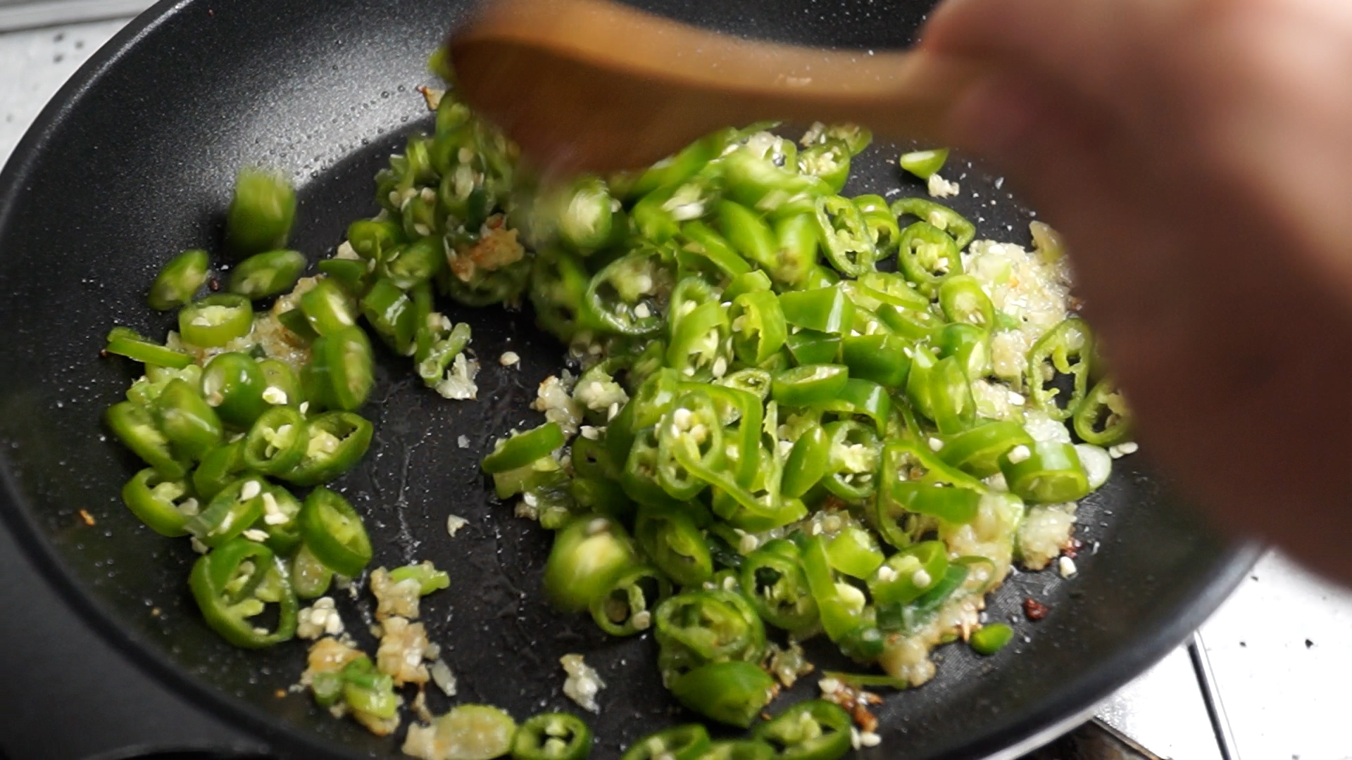 16. 땡초를 넣고 불을 강불로 올린다음 1분 30초 정도를 볶아주세요. 너무 오래 볶으면 땡초 특유의 매운향이 반감되니 시간 지켜주세요.