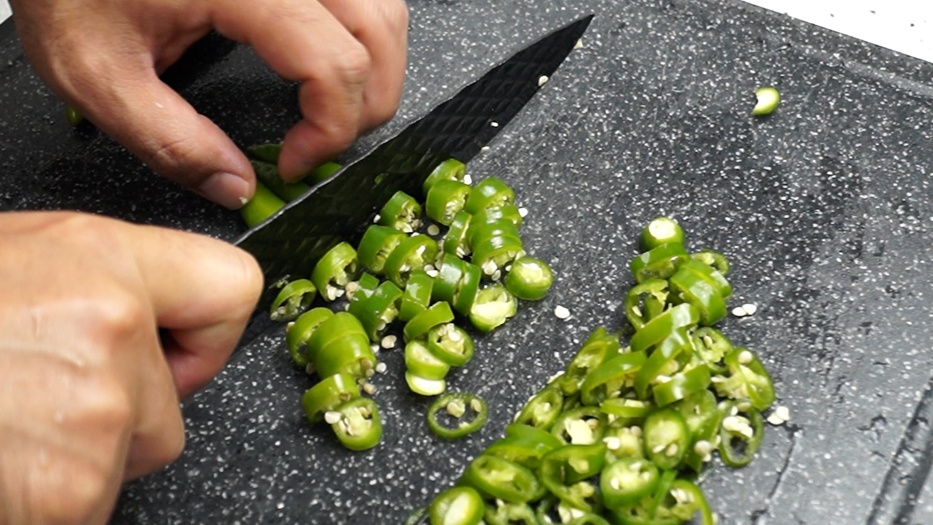 3. 땡초 10~11개를 대략 0.5cm 크기로 잘라주세요. 너무 매운게 싫으시면 꽈리고추를 사용하시는것도 좋습니다. 고추씨는 기호에 따라 제거해주세요. 참고로 찬물에 담궈서 설설설 흩어주면 제법 잘 빠진답니다.