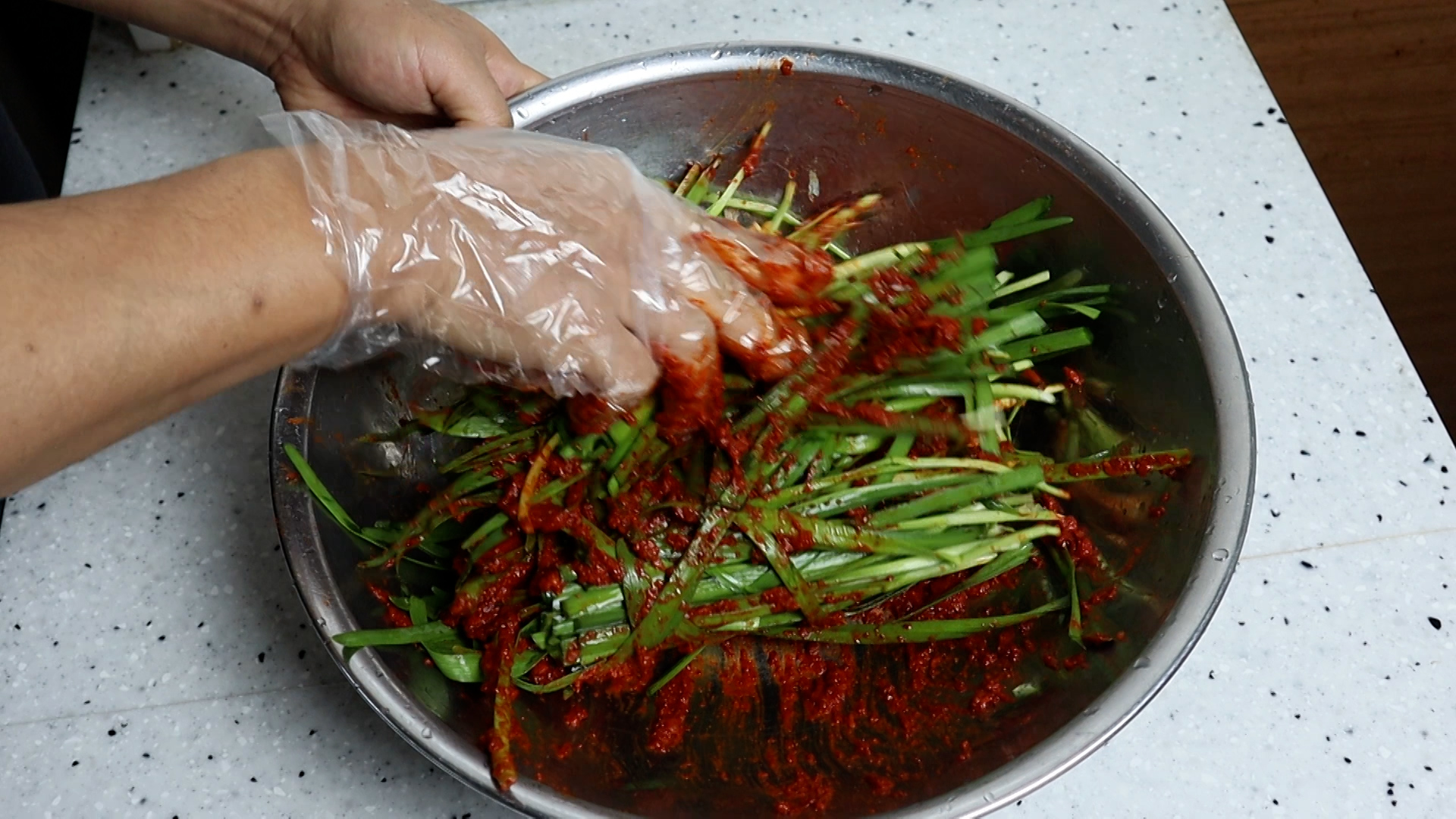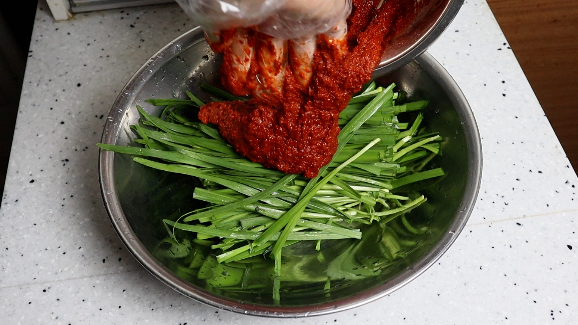 13. 부추를 겉절이 치대듯 치대는게 아니라 조금씩 잡아서 한방향으로 굴려가면서 양념을 골고루 무쳐주세요.