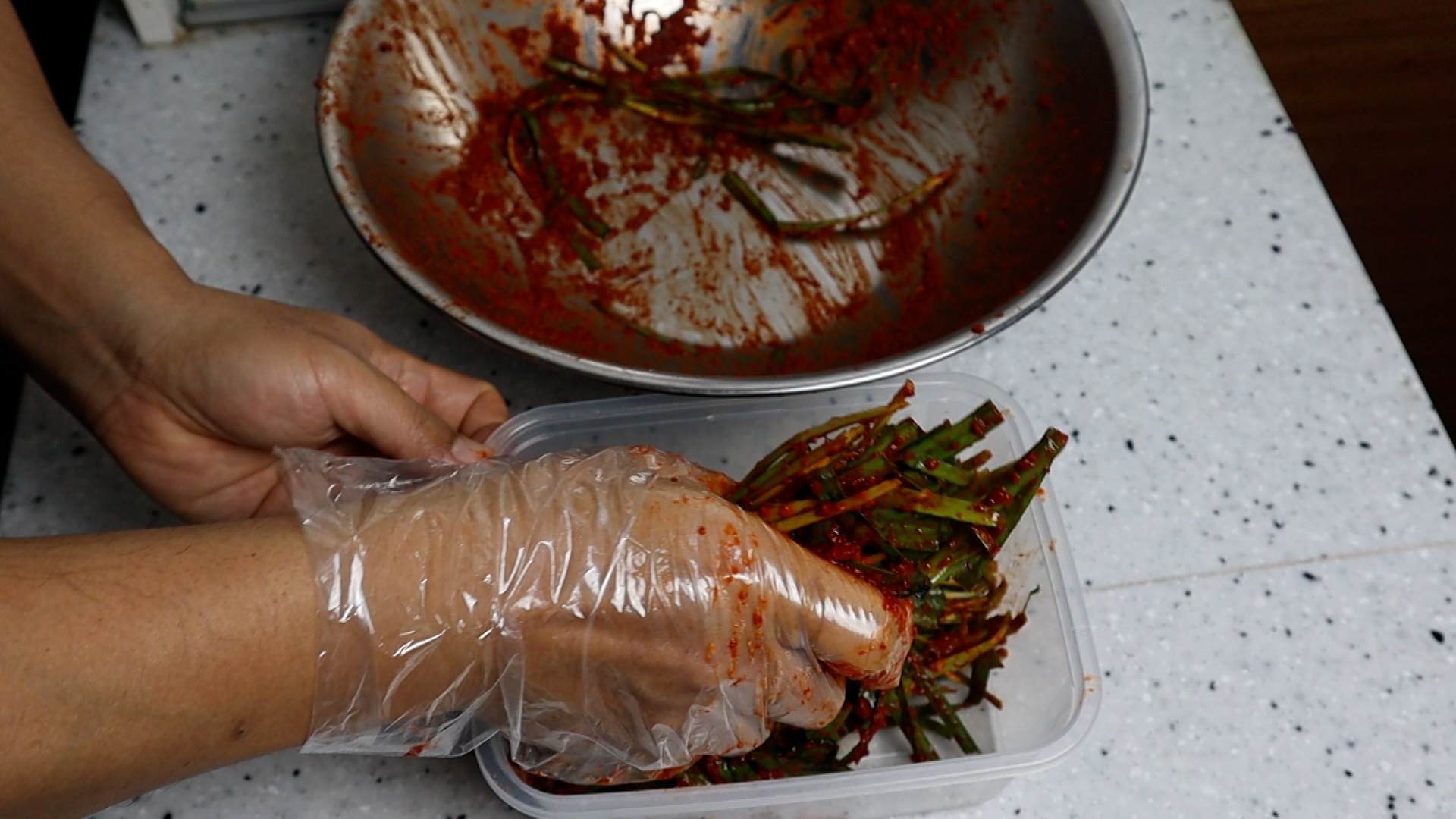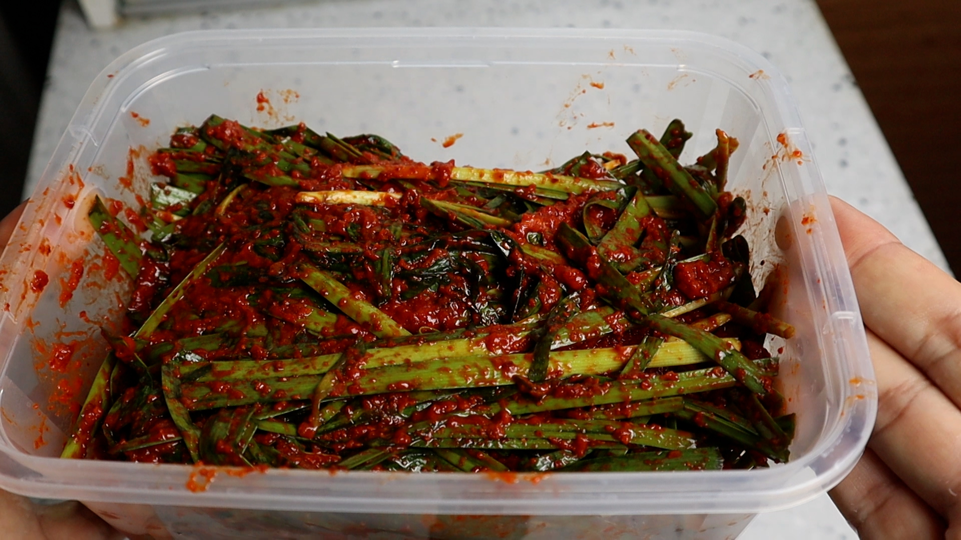 14. 버무린 부추를 통에다 담아주시고 양념이 남았으면 밀폐용기에 담아 뒀다가 다음에 김치류 담으실때 사용하시면 좋고 찌개류가 싱거울때 적당히 덜어 넣으셔도 좋답니다.