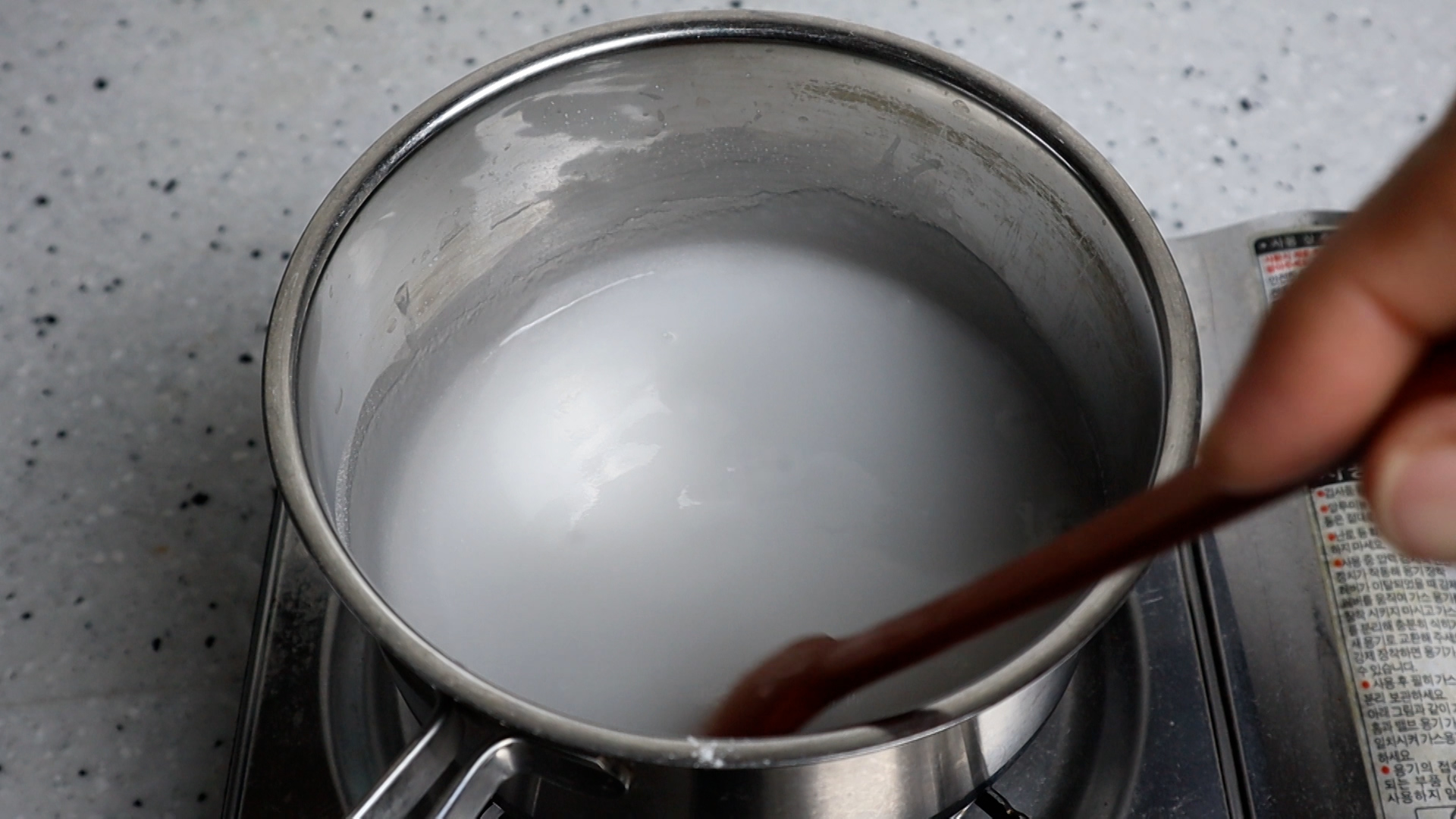3. 불을 중불로 올리고 가루가 뭉치지 않게 저어주면서 2~3분을 끓여주세요. 찹쌀가루가 바닥에 금방 엉겨 붙으니 끓이는 동안 계속 저어주시는게 좋습니다.