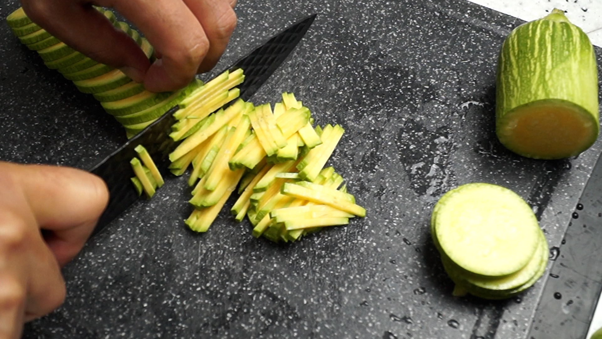 2. 호박은 대략 0.5cm 정도르 채를 썰어주세요. 너무 가늘게 하면 수분이 많이 나와서 그런지 전이 전체적으로 질척이더라고요. 혹시나 더 얇은게 좋으시면 나중에 부침가루 양을 10% 정도 늘여주세요.