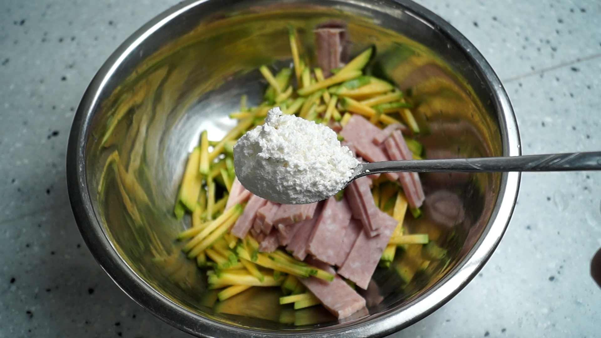 3. 스팸 또는 리챔을 호박 처럼 너무 두껍지 않게 채를 썰어주세요. 기호에 따라 뜨거운 물에 한번 데치는것도 좋아요. 데칠때는 통으로 데치는 것보다 잘라서 데치는게 기름도 더 많이 빠지고 아질산 나트륨 같은 색소가 더 많이 제거가 되겠죠^^