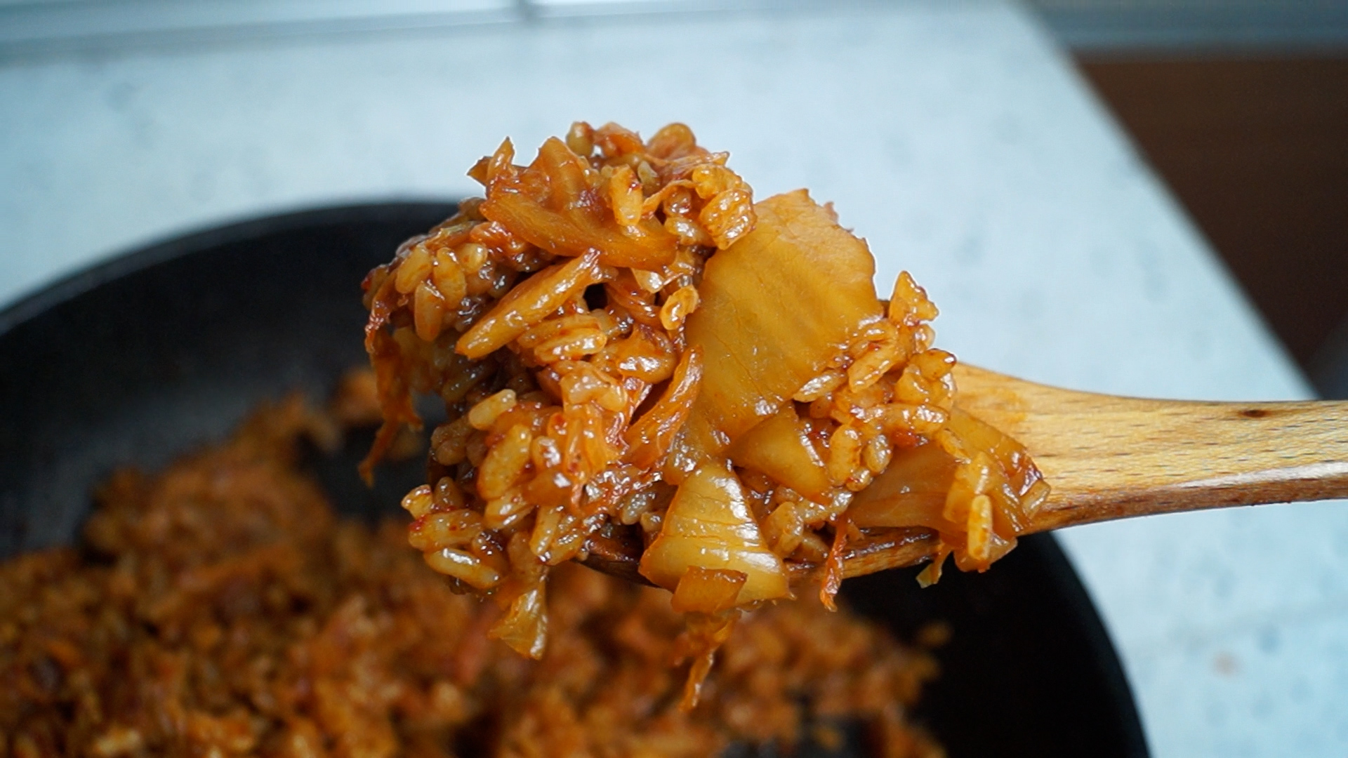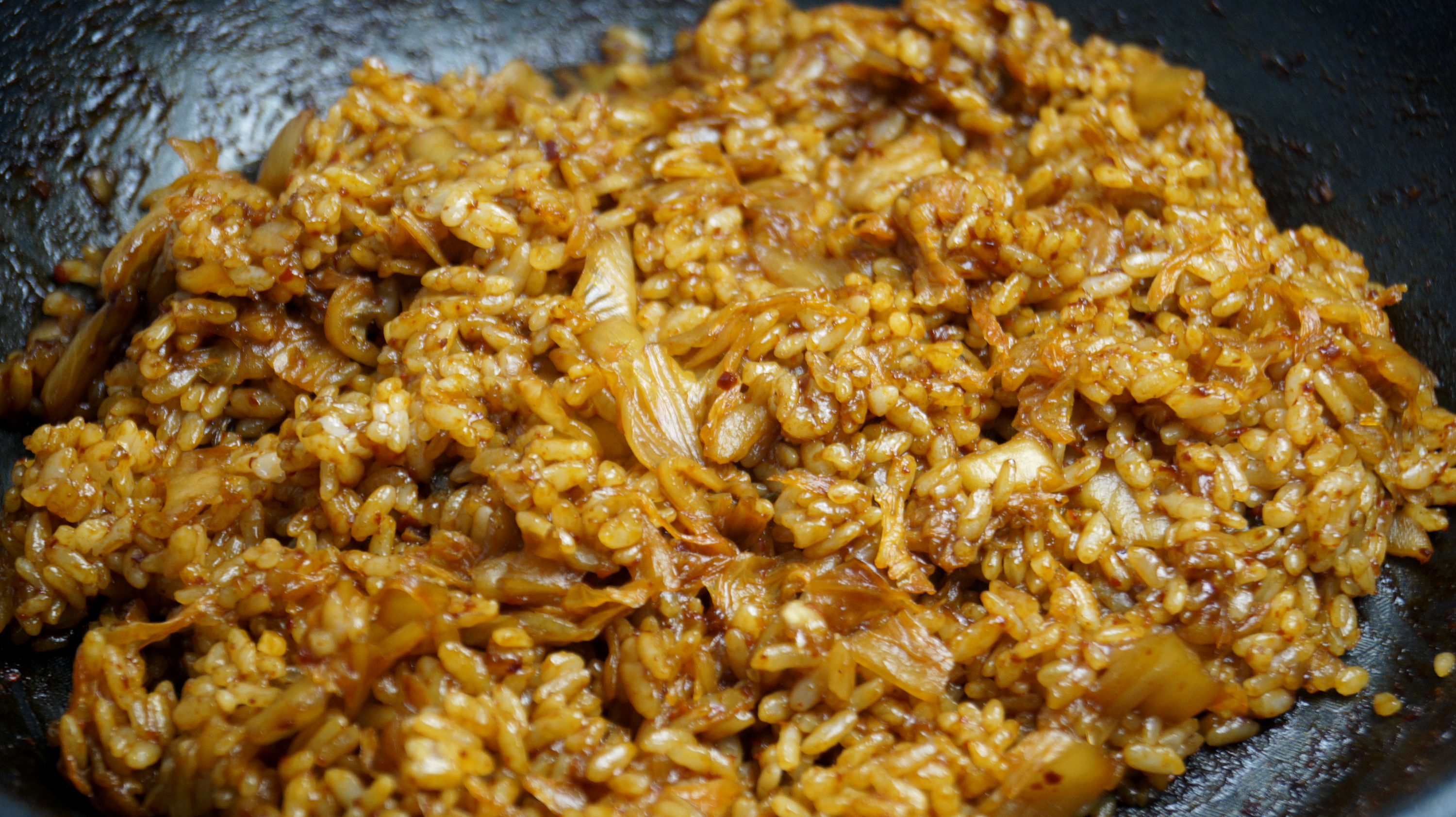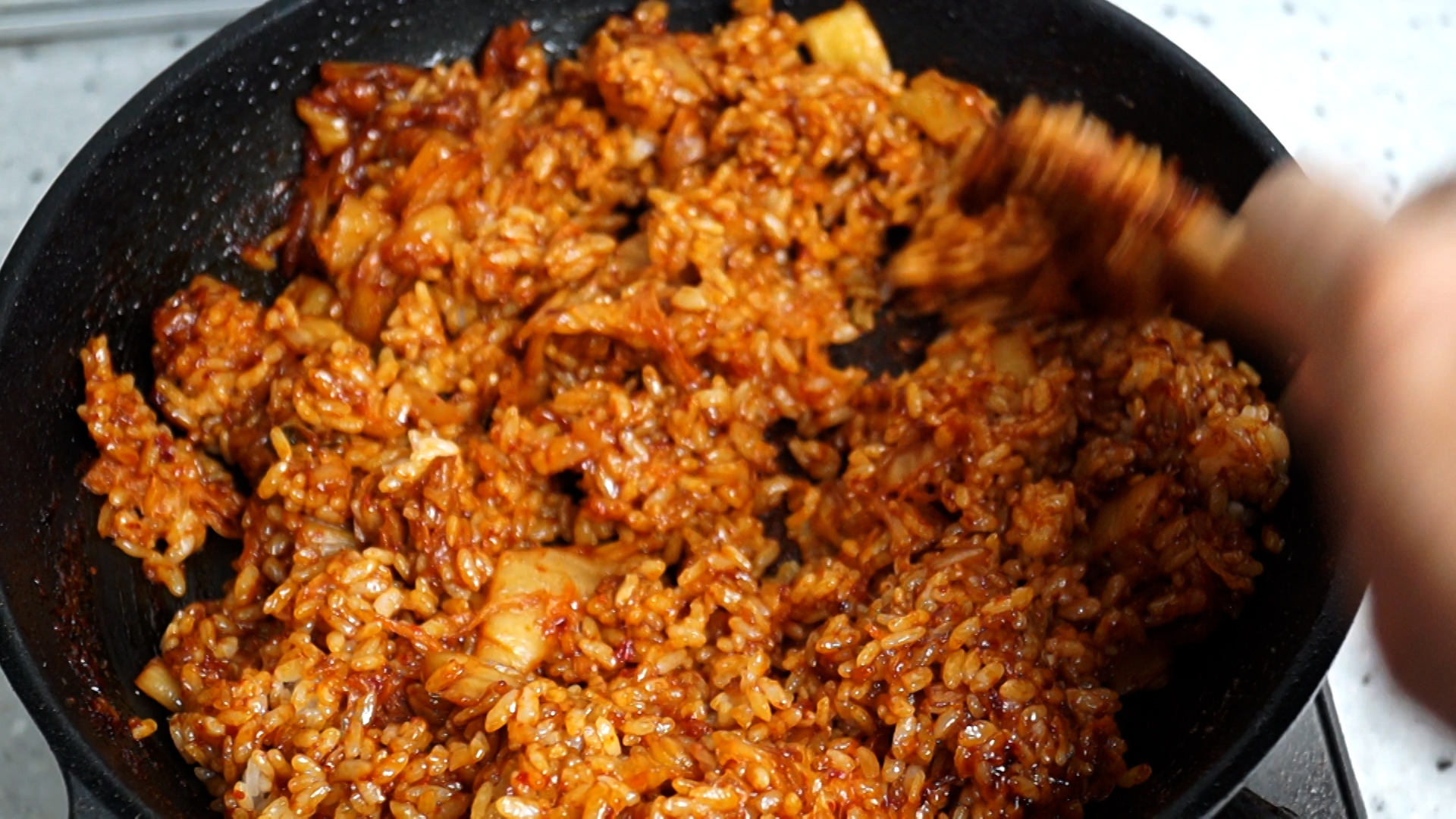 17. 색감 보시면 아시겠지만 그간 먹던 김치볶음밥과는 차원이 다르게 양념이 꾸덕합니다! 그러니 스텐펜이 아니라 코팅팬에 볶아주셔야 양념이 조금씩 늘어 붙어도 섞어가면서 더 맛있게 만들수가 있습니다.