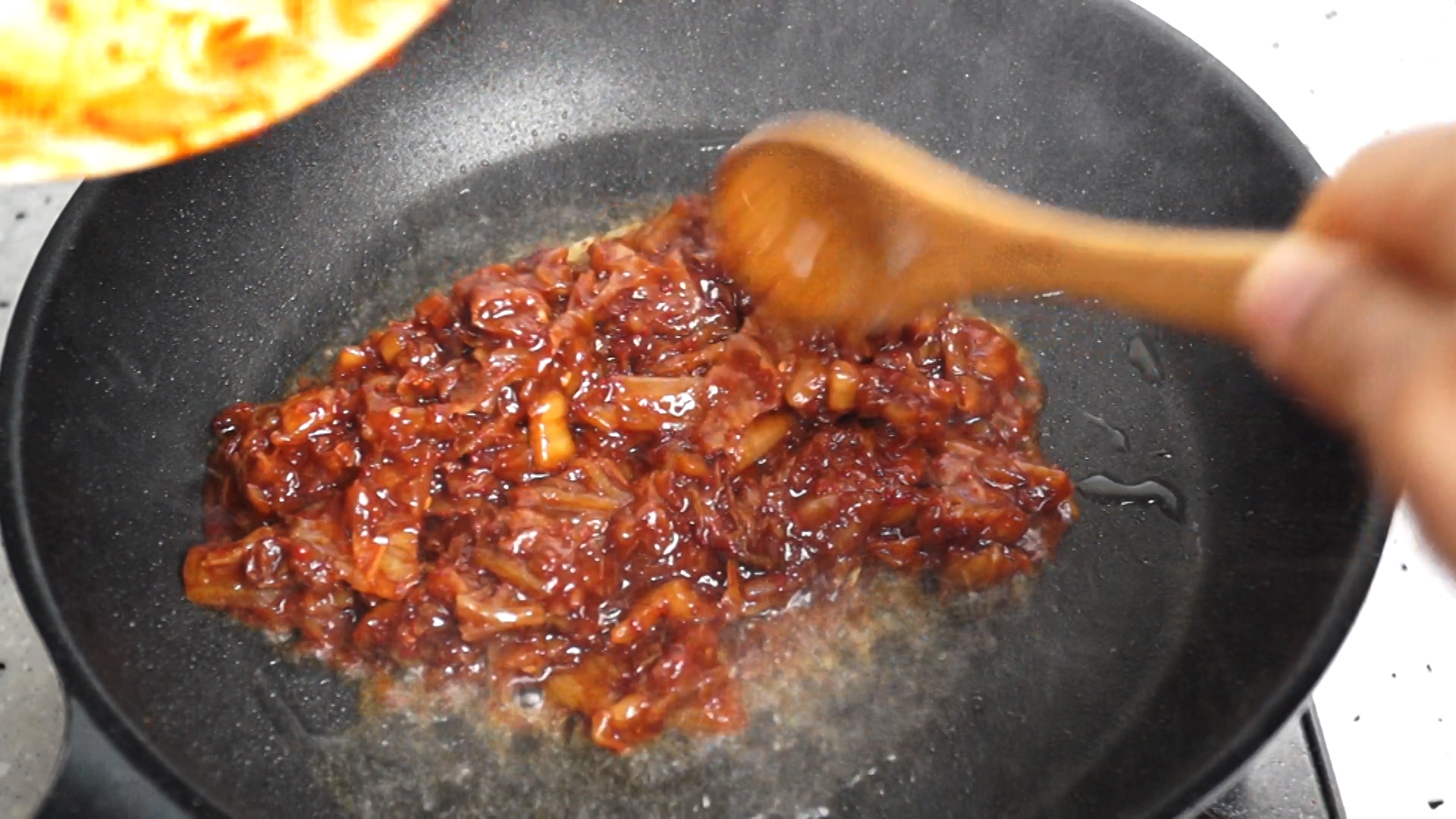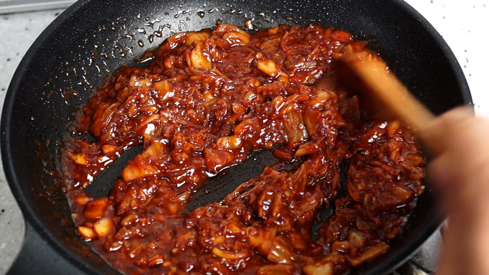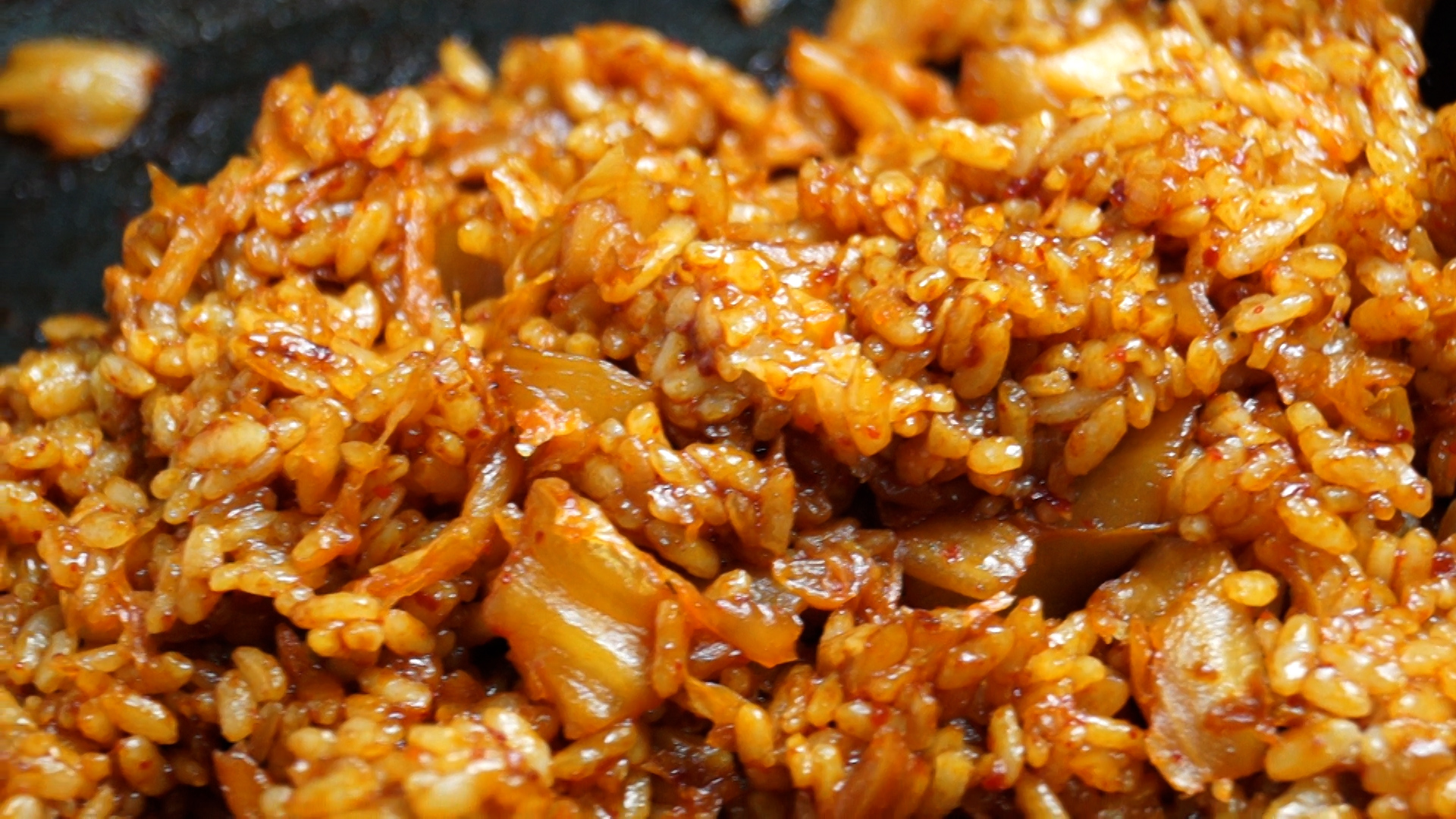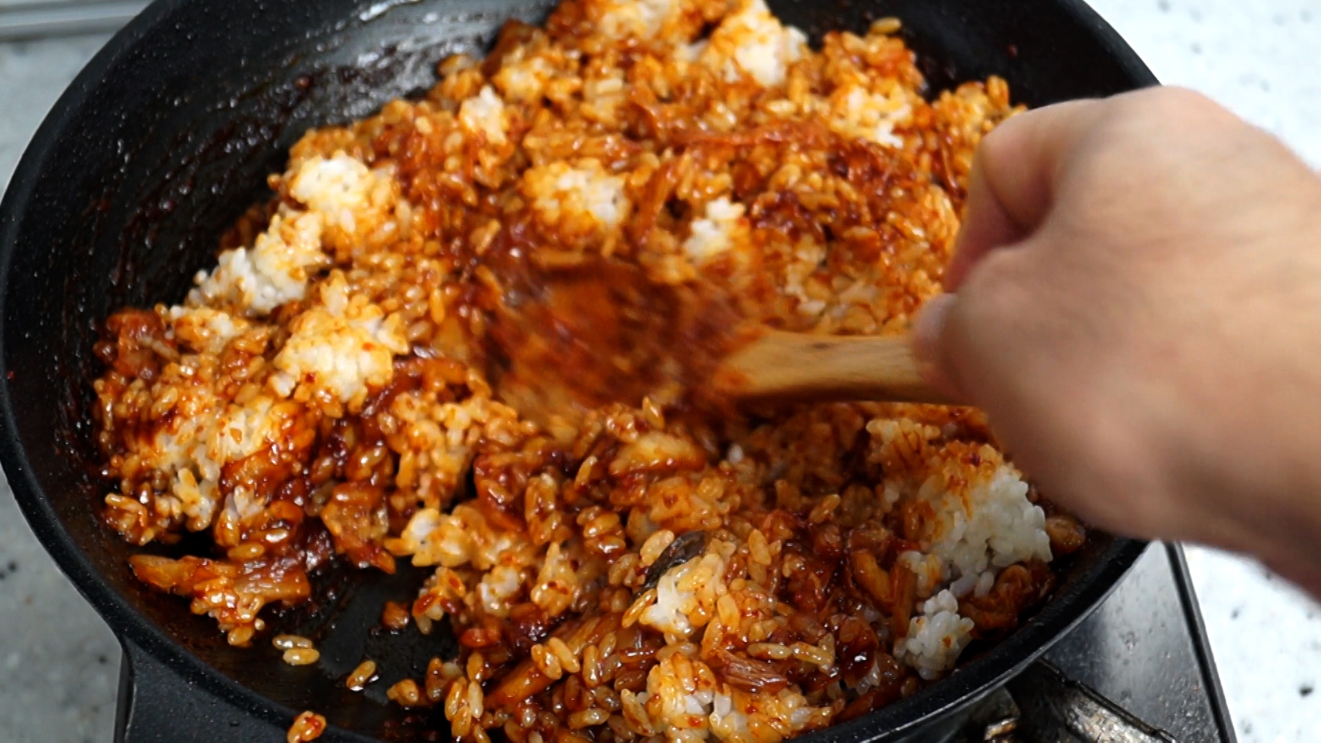 17. 색감 보시면 아시겠지만 그간 먹던 김치볶음밥과는 차원이 다르게 양념이 꾸덕합니다! 그러니 스텐펜이 아니라 코팅팬에 볶아주셔야 양념이 조금씩 늘어 붙어도 섞어가면서 더 맛있게 만들수가 있습니다.