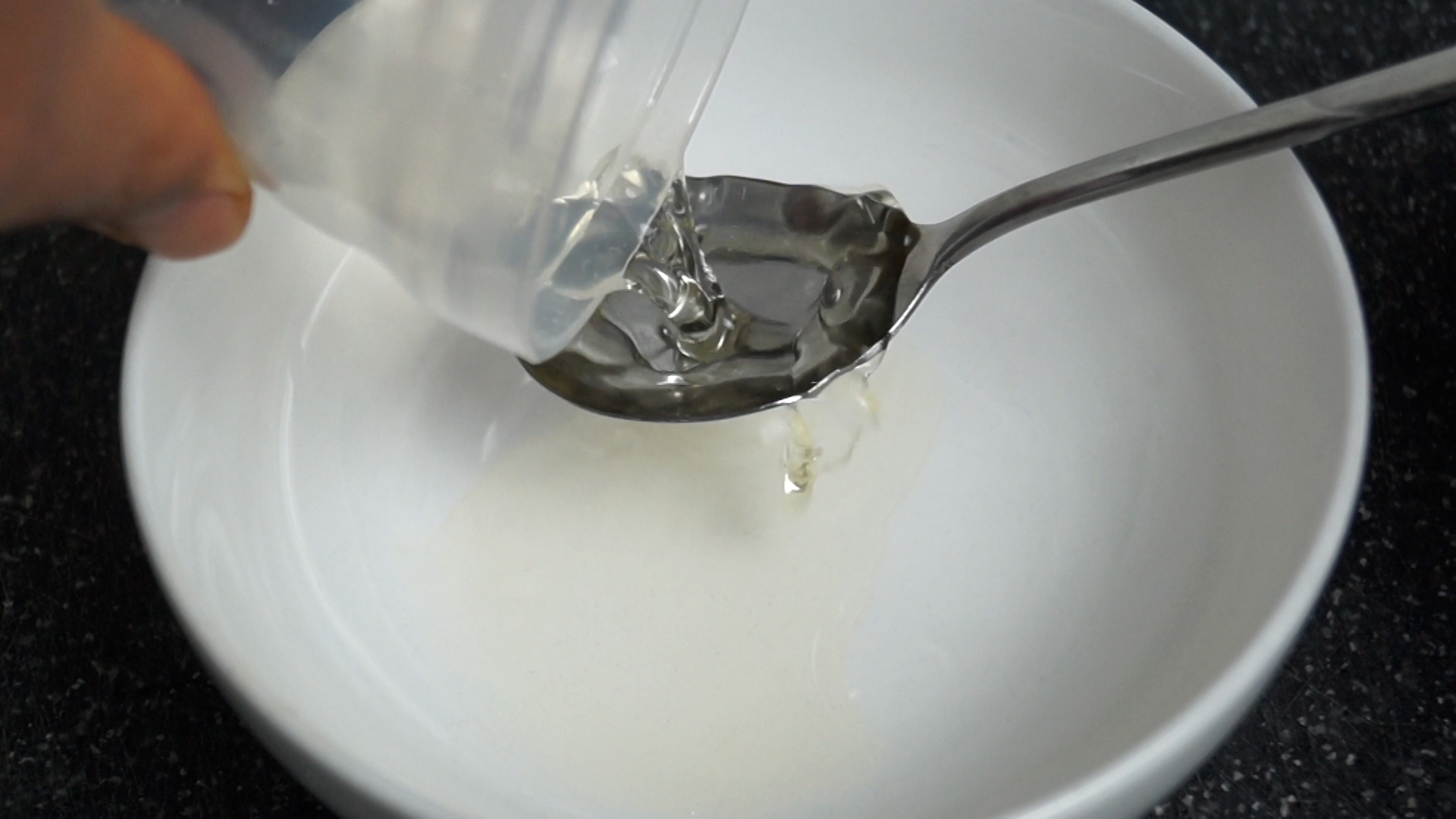 3. 볼에 알콜도수 14% 짜리 미림 2스푼 16g을 부어주세요. 미림이 없으시면 그냥 맹물을 부으셔도 됩니다.