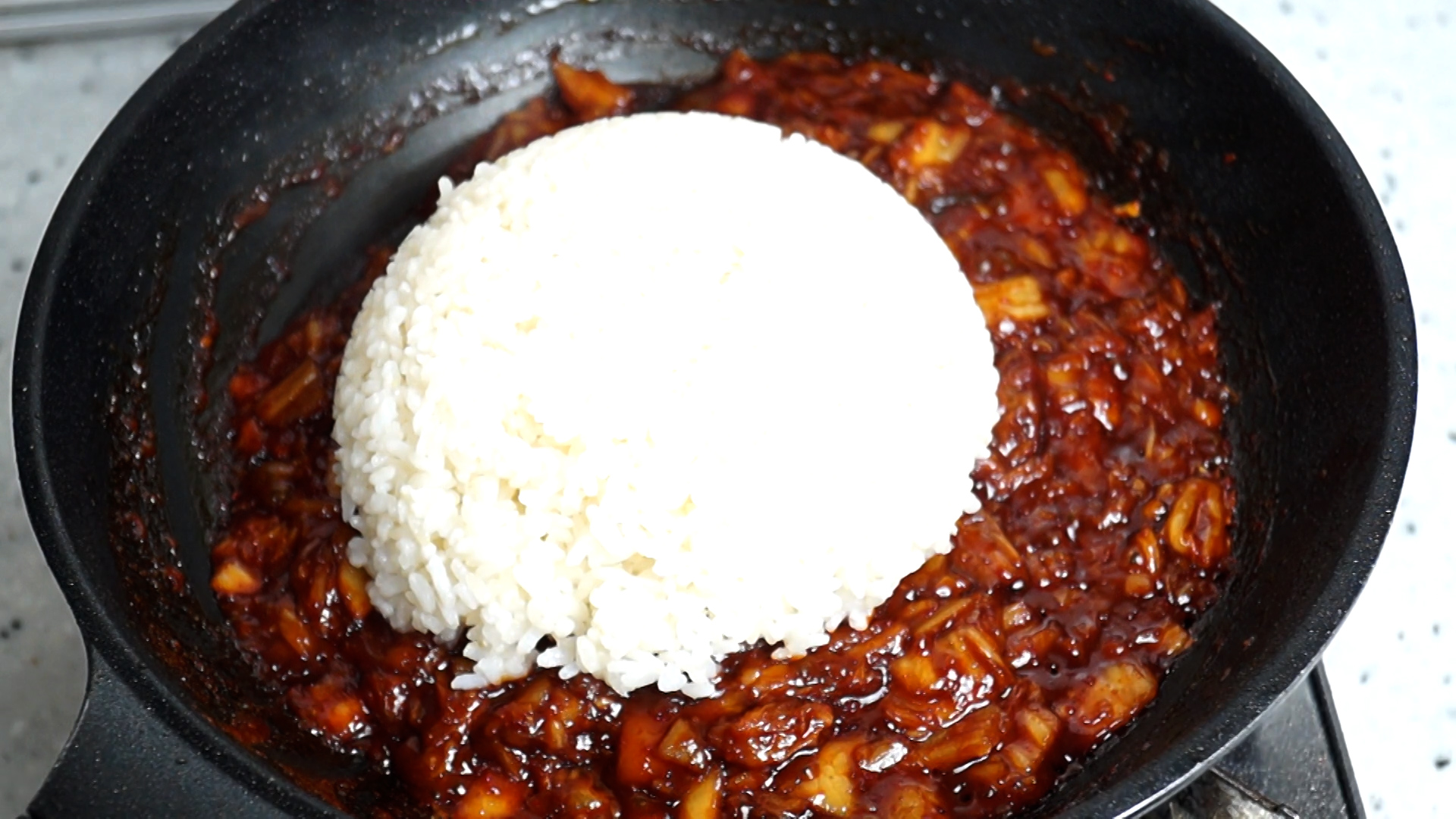 15. 밥을 넣어주는데 간을 찐!! 하게 드시고 싶으시면 햇반을 1개를 1공기로 생각했을때 2공기 420g 부어주시고 간을 조금 약하게 드시는 편이면 밥 양을 10~20% 더 추가해주세요.