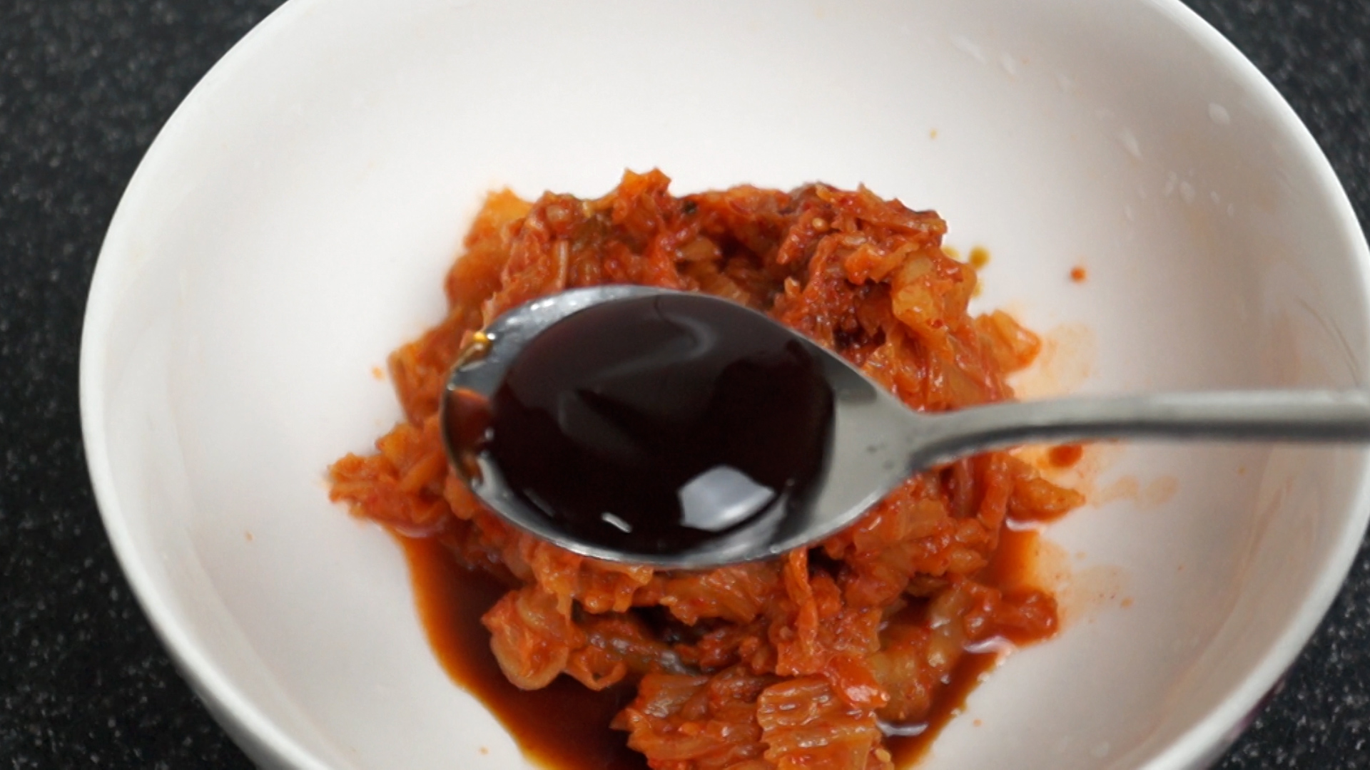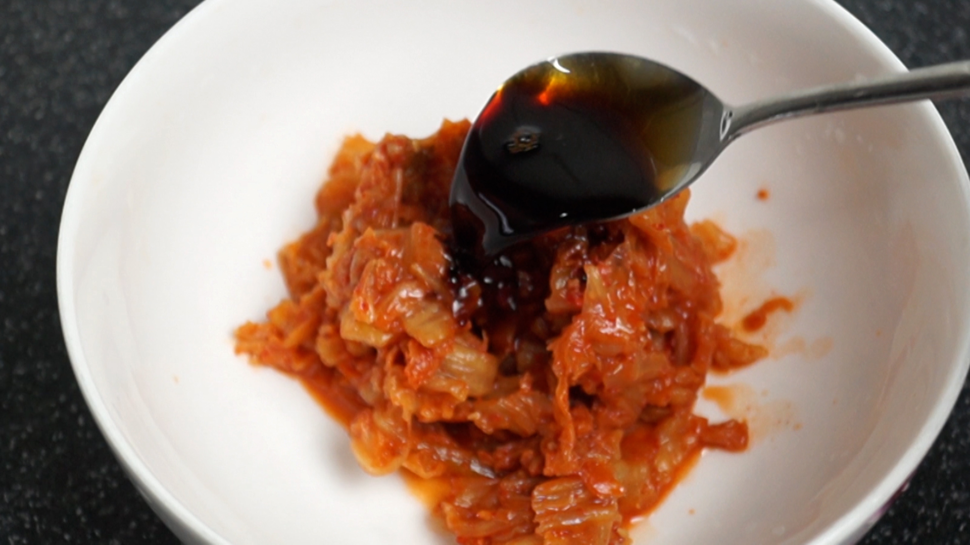 5. 대접에 김치를 넣고 양념란에 재료를 전부 넣어주세요. 간장은 진간장을 사용해주세요.