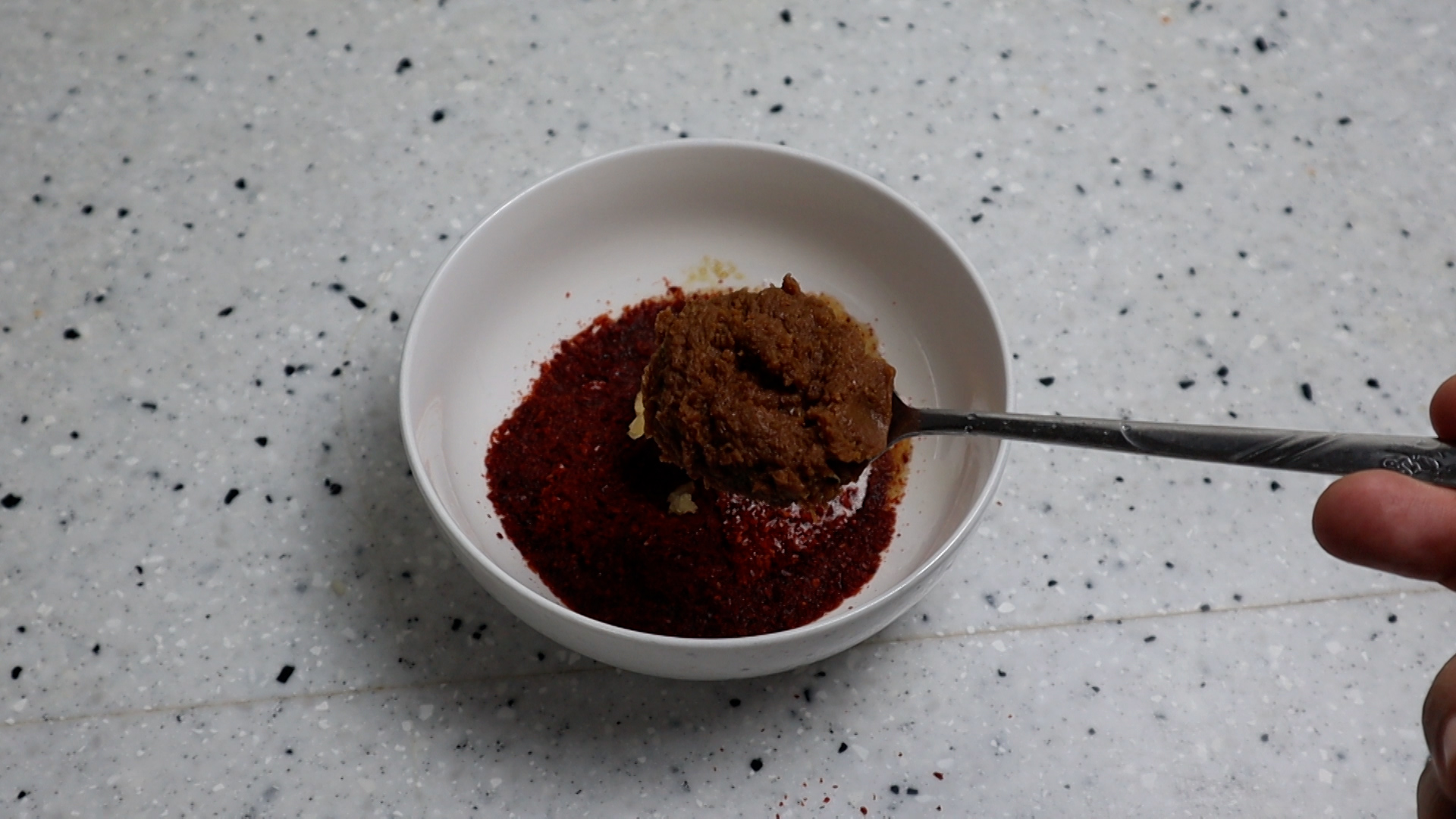 1. 맛있는 국물 비법 양념장 부터 만들께요. 고춧가루를 포함한 양념란에 있는 재료를 한데 넣어주세요.