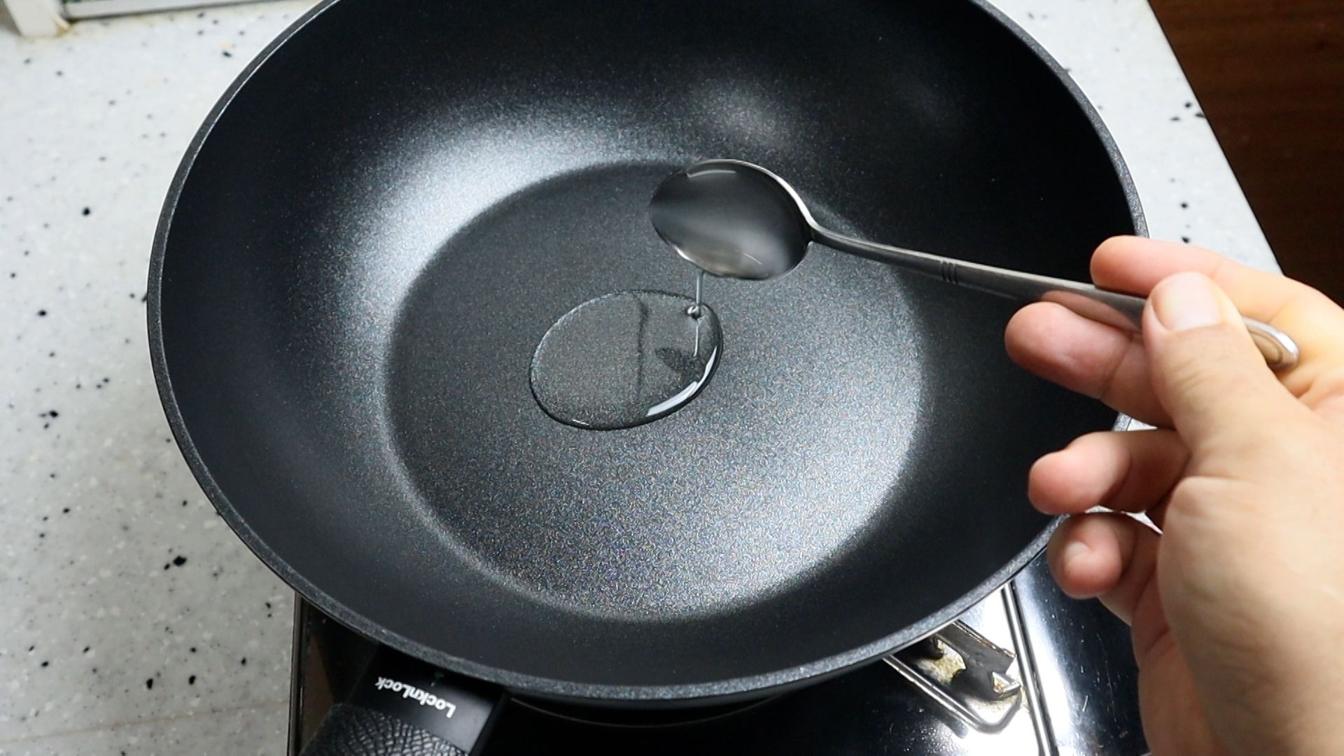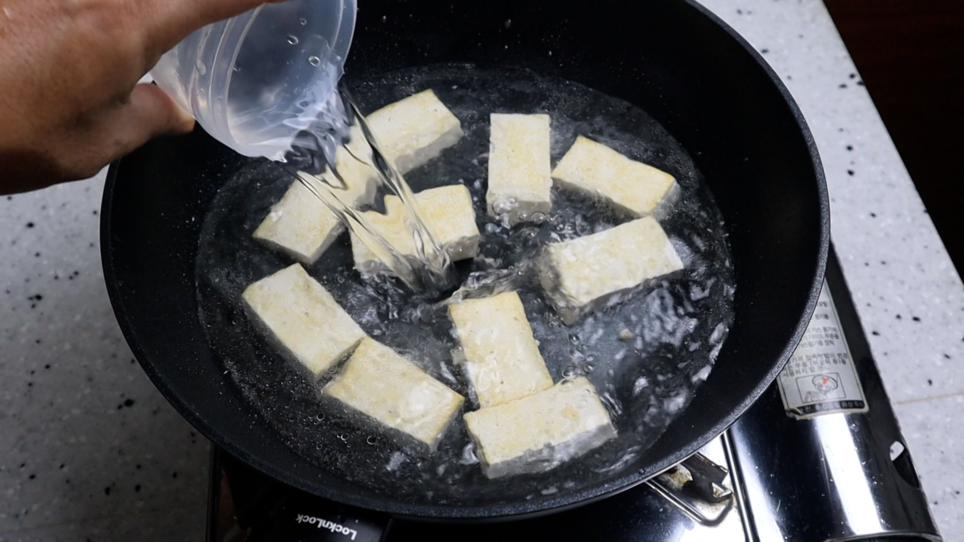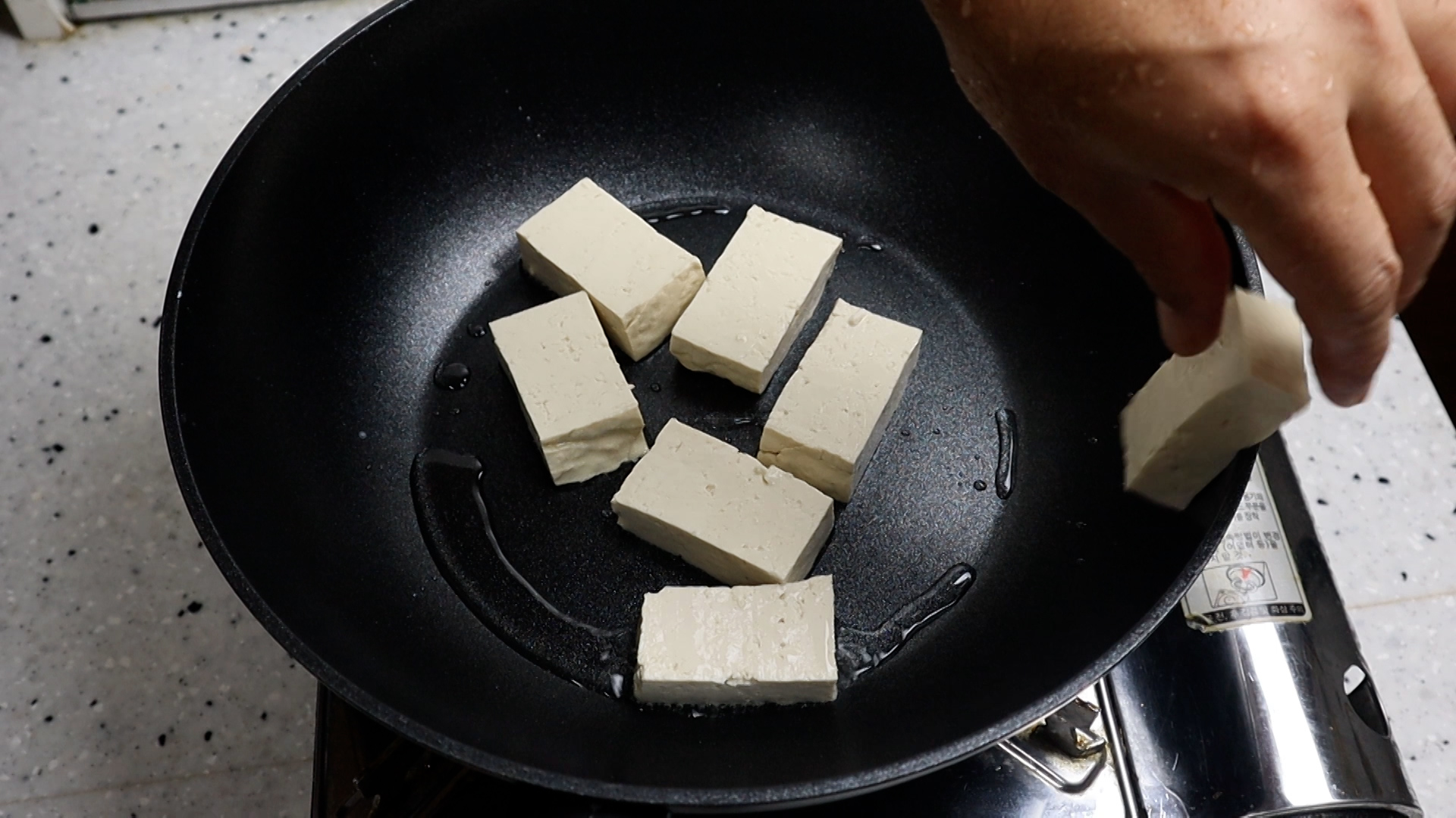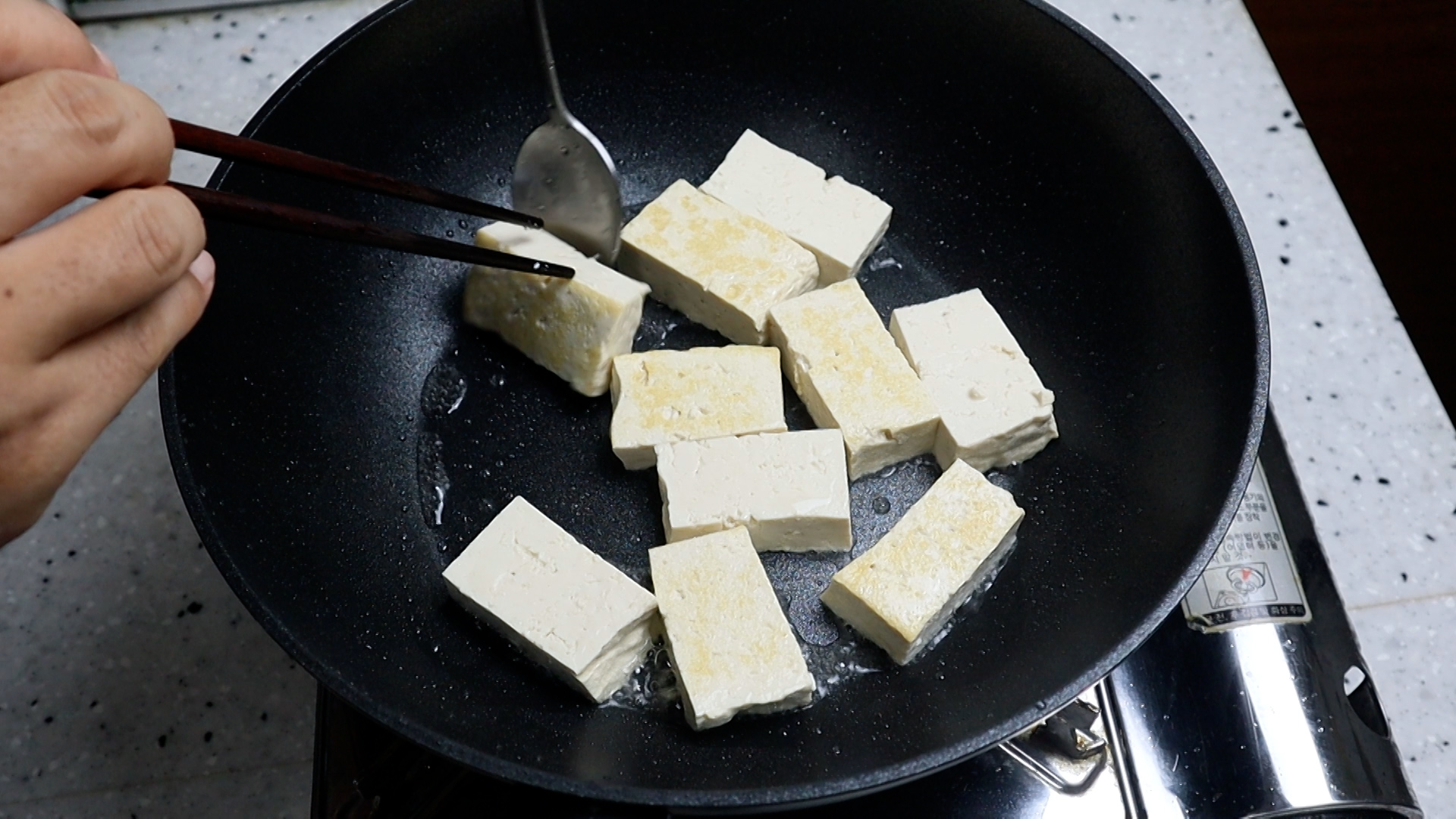 15. 웍에 식용유 1를 붓고 강불로 달군 다음 두부를 전부 넣어주세요.