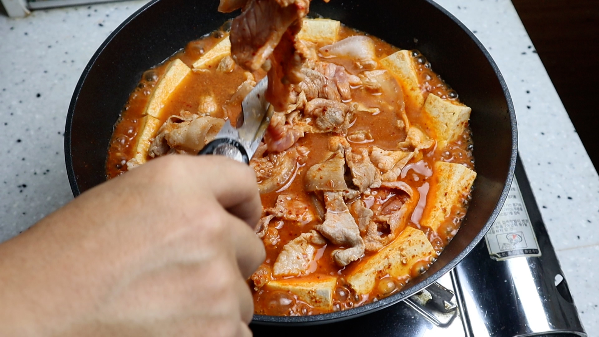 19. 1분 정도를 바글바글 끓인 다음 고기를 먹기 좋은 크기로 잘라주세요.