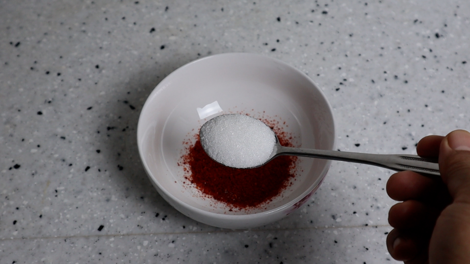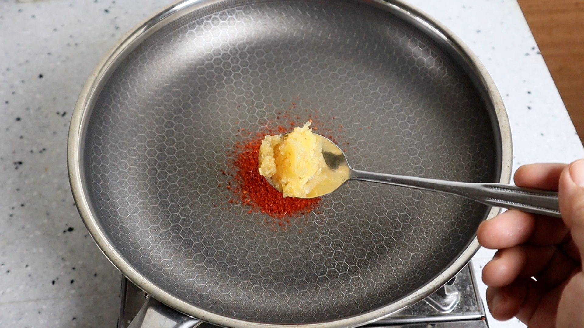 12. 팬에 고춧가루와 마늘을 넣어주세요. 양념에 넣은것과는 달리 기름을 낼때 쓸거라 따로 넣어주세요.