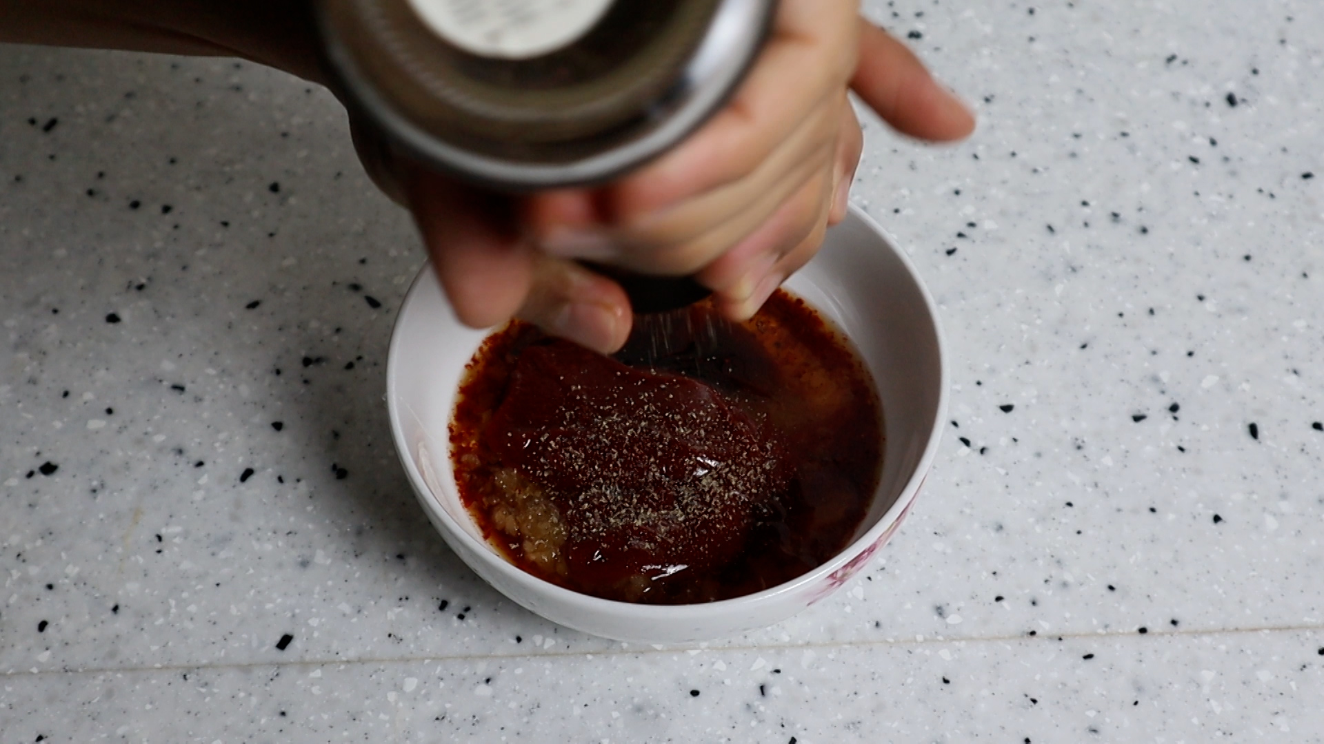 10. 고추장은 고봉으로 퍼지말고 깍아서 넣어주시고 후추가루를 1~2꼬집 뿌려주세요.