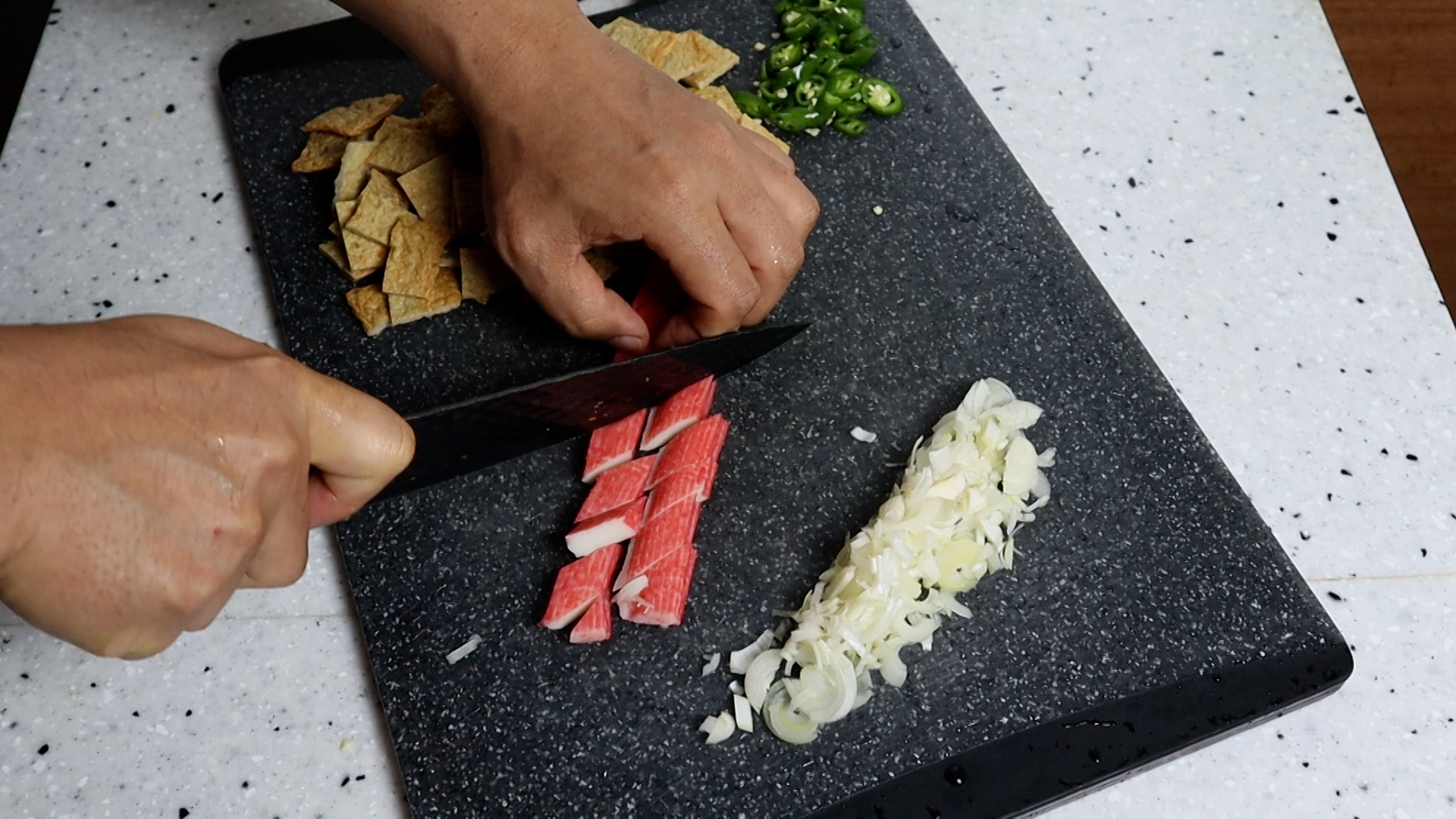 4. 맛살 2줄을 먹기좋게 썰어주세요. 저렴이 맛살을 쓰셔도 볶았을때 맛살이 퍼지지 않습니다. 맛살이 없다면 어묵으로 동량 대체를 하시면 됩니다.